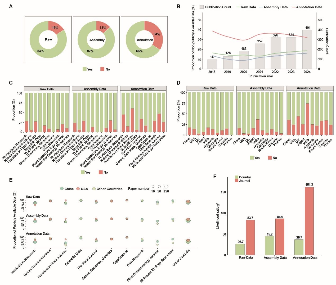 自2000年首个植物基因组发表以来,全球已发表超过1500种植物的基因组数据。尽管开放科学和FAIR数据原则(Findable, Accessible, Interoperable, Reusable)已逐渐成为共识,但在实际数据共享过程中,仍普遍存在数据可获取性不足、共享标准不一致等问题,严重制约了其潜在价值的充分发挥,并影响科学研究的可重复性。因此,系统性地分析与评估当前植物基因组数据共享现状,对于推动其科学利用与发展至关重要。 近日,中国科学院昆明植物研究所马永鹏研究员专题组基于PubPlant数据库,系统收集并整理了2018至2024年间发表的1717篇植物基因组论文,这一时间跨度覆盖了植物基因组测序技术快速迭代与基因组资源集中增长的关键阶段。为了评估基因组数据的共享情况,研究团队对这些论文中的原始基因组测序数据(Raw data)、组装数据(Assembly data)和注释数据(Annotation data)公开情况进行逐一核查。分析显示,植物基因组数据的公开情况令人担忧:高达40.83%的论文未能同时公开这三类数据。其中,注释数据未公开率最高,达34.07%,远超原始数据(16.07%)和组装数据(13.28%)。研究还发现,即使在论文发表后,通过邮件联系作者获取未公开数据也极为困难:近70%的数据请求未能成功,反映出当前数据共享机制在实践中的严重不足。 为进一步分析影响这三类数据公开率的关键因素,研究团队采用多变量Firth校正逻辑回归模型(multivariable Firth-corrected logistic regression)和似然比检验(Likelihood Ratio Test)等多种统计方法,量化了期刊、国家、分类单元及基因组大小等因素对数据公开率的解释力度。统计结果显示,对于所有三类数据,“期刊效应”(Journal Effect)对数据是否公开的解释力度最高,显著强于“国家效应”(Country Effect),这表明期刊的数据政策在推动数据共享方面起着更关键的作用。 为解决上述问题,研究团队呼吁科学共同体中的关键参与者:期刊、政策制定者、数据库平台、作者、审稿人以及读者,共同积极推动基因组数据的开放共享。建议通过在论文发表流程中核验数据真实性与可访问性、完善注释数据提交规范、鼓励同步公开标准化注释文件及质量控制信息,以提升数据共享的可用性;同时提出资助政策、数据库支持、审稿核验及规范引用与再利用实践等方面的建议。相关成果以Plant genome data sharing: a call towards fully open access为题在线发表于植物学知名期刊Plant Communications。中国科学院昆明植物研究所硕士研究生杨昊和博士后刘雄芳为论文共同第一作者,马永鹏研究员与博士研究生张仁纲为共同通讯作者。中国科学院西双版纳热带植物园硕士研究生罗贞参与了该工作。该研究获得了国家自然科学基金林草联合基金重点项目(U2571210)和中国科学院昆明植物研究所战略先导科技专项(KIBXD202401)等项目的支持。