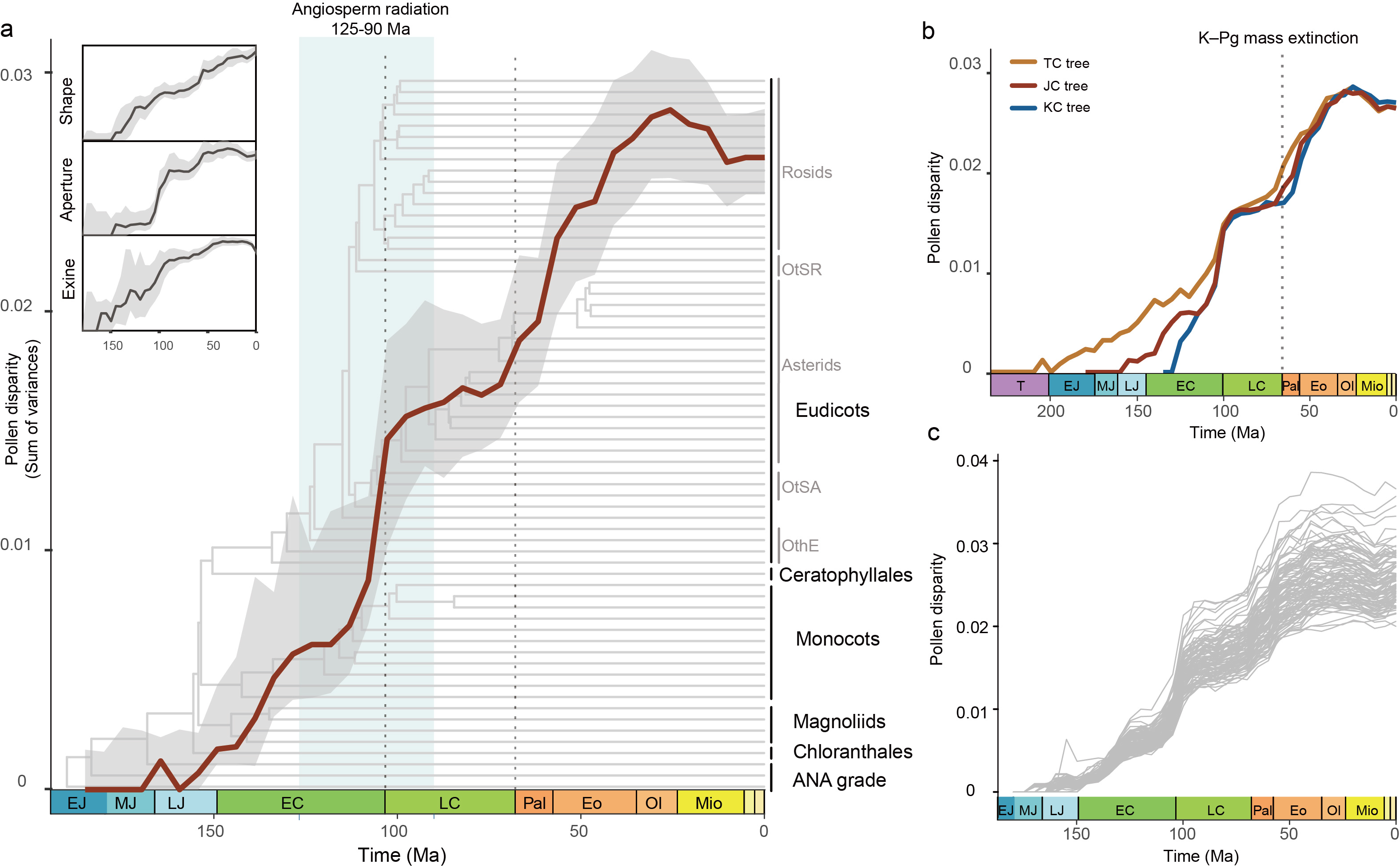 图2 被子植物花粉的形态空间展示:a) 基于nmds排序的现存花粉形态空间分布;b) 被子植物主要类群的形态多样性比较;c) 理论花粉形态空间 研究团队将花粉的形状、萌发孔和外壁结构等特征,投射到一个降维的“形态空间”当中。利用时间校准的系统发育树,研究人员不仅定位了现存类群在形态设计空间中的位置,还推演出它们的祖先形态空间和理论形态空间(theoretical morphospace)。研究发现,现存的被子植物花粉已经演化了解剖学所允许的理论形态空间相当大的区域。然而,这种演化并非均质分布,而是在局部表现出高度聚集,这展示了现存的受约束的花粉形态景观。形态趋同分析也明确了自然选择对花粉形态空间的强烈导向作用,高度趋同的属对显著富集在分类距离较远的演化分支里,表明了由相似选择压力驱动的独立适应性事件。此外,花粉形态多样性与分类多样性完全解耦,其中基因组大小和传粉模式对花粉形态空间的解释力十分有限。该研究强调了形态差异度作为一个独立且关键的指标,为理解不同层级和尺度下的植物演化过程提供了独特的信息。 进一步的研究表明,被子植物花粉的形态差异并非简单的随时间线性增加,也不是在起源初期经历单一的爆发性增长,而是表现为两次主要的脉冲式增长,该结果在不同的冠群被子植物年龄假说情形中都保持了稳定。这两次脉冲式上升分别发生在白垩纪中期和古近纪。在白垩纪早期,花粉形态差异度处于较低水平,随后在白垩纪中期迅速跃升到一定的水平,这可能正是达尔文观察到的“讨厌之谜”背后的真实演化过程。第二次脉冲式上升则紧随白垩纪-古近纪(K-Pg)大灭绝之后,随着恐龙时代的森林衰退,被子植物迎来了气候波动和全球植被重组的机遇,出现了形态创新的另一个高峰。内在的形态创新与外在的关键环境机遇相结合,共同驱动了这种脉冲式演化模式。这表明,被子植物整体上保留了应对环境巨变、不断演化出新形态域的潜力。该研究为理解作为迄今地球上最为成功植物类群的被子植物如何确立其演化和生态优势,提供了来自花粉形态的有力证据。