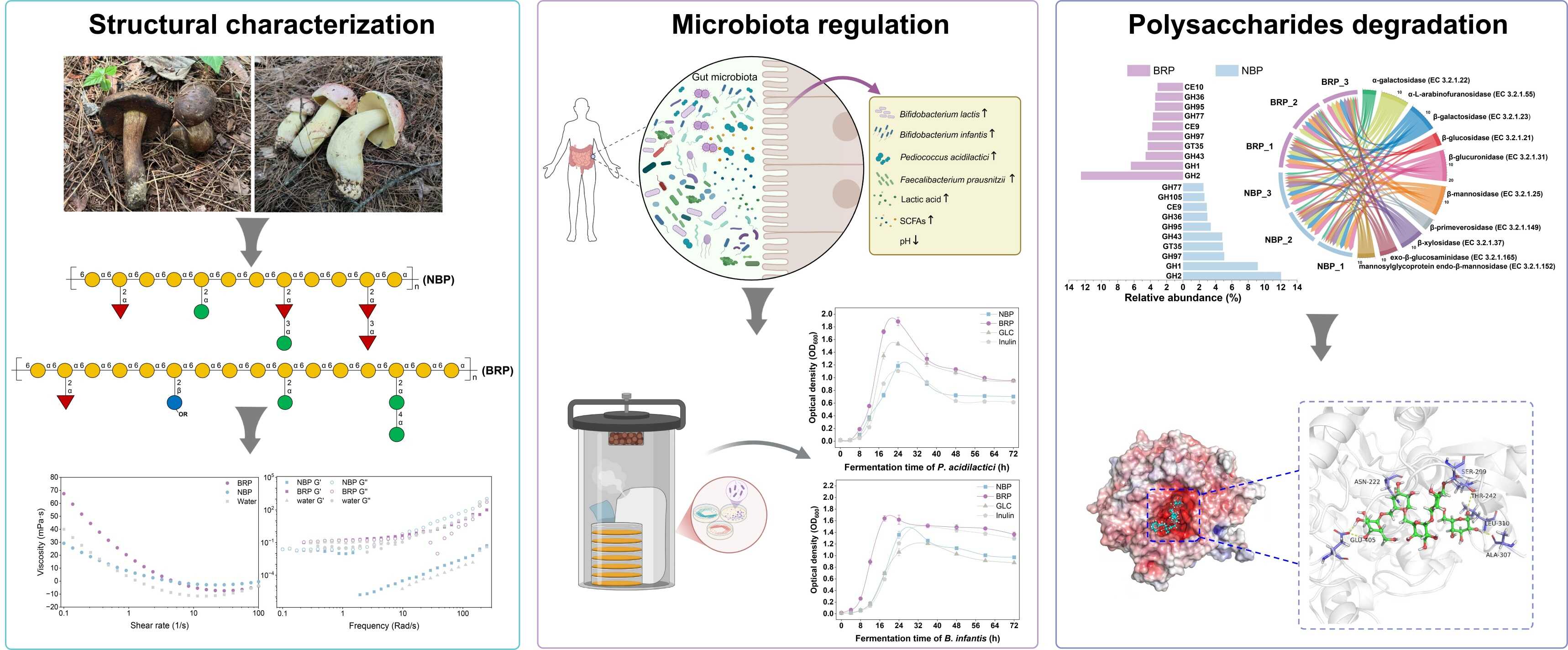 云南被称为“野生菌王国”,野生食用菌适生面积、产量、产值均居全国第1位。目前全省已知野生食用菌约900种,占我国食用菌种类的91%、世界的45%。以松茸、松露、牛肝菌和羊肚菌——“世界四大名贵菌”为代表的高值真菌在云南分布广泛,资源量大。云南食用野生菌风味独特、营养价值高,享誉世界。云南野生真菌中含有萜类、酚类、有机酸、生物碱等活性小分子,同时也富含蛋白、多肽、多糖等生物大分子,但其生物活性物质基础与作用功效等尚缺乏深入系统的科学研究。 长期以来,中国科学院昆明植物研究所植物化学与天然药物全国重点实验室的吴明一研究员团队,面向人民生命健康和地方经济社会发展的重大需求,致力于云南植物和高等真菌等特色生物资源在生命大健康领域的创新利用,开展天然多糖的纯化制备、结构解析、药理活性以及成药性评价等相关基础研究,促进天然糖类新药物的发现与创制。 近年来,该团队系统挖掘云南特色资源中的多糖活性成分,发现了一批结构新颖、活性显著的天然多糖,先后解析并揭示了促进肠道益生菌增殖活性的多花黄精果聚糖和半乳聚糖(Zhang et al., Carbohydr. Polym., 2021)、抗炎活性的小白及葡甘聚糖(Gu et al., Carbohydr. Polym., 2022)、调节免疫的马齿苋半乳糖醛酸聚糖(Li et al., Int. J. Biol. Macromol., 2024a)和滇黄精果聚糖(Chen et al., Int. J. Biol. Macromol., 2024b),以及具有疫苗佐剂活性的粗根荨麻果胶(Wang et al., Int. J. Biol. Macromol., 2024c)等多糖的化学结构与药理功能,形成了云南特色资源天然多糖功效物质基础研究的创新技术体系。 近期,该团队与塔里木大学万传星教授团队合作,对云南常见牛肝菌中的茶褐新牛肝菌(Neoboletus brunneissimus)与玫黄黄肉牛肝菌(Butyriboletus roseoflavus)开展了功效活性成分的发掘研究,纯化解析了2种结构新型的富含侧链的半乳聚糖。 进一步经体外肠道菌群模拟发酵研究发现,2种新型半乳聚糖均能促进乳酸片球菌、乳双歧杆菌和婴儿双歧杆菌等肠道有益菌显著增殖,以及使产丁酸肠道菌群显著富集,提高乙酸盐、丙酸盐与丁酸盐的浓度,降低微环境pH值,维护肠道微环境和维持宿主能量稳态。 进一步宏基因组学分析表明,拟杆菌科肠道细菌是降解此类半乳聚糖的主要功能类群,发挥多糖降解功能的细菌主要来源于分泌糖苷水解酶的GH2与GH1家族。多糖与水解酶的分子对接实验,揭示了与多糖底物的特异性识别和结合模式依赖于糖苷水解酶的特异性空腔和氨基酸位点。