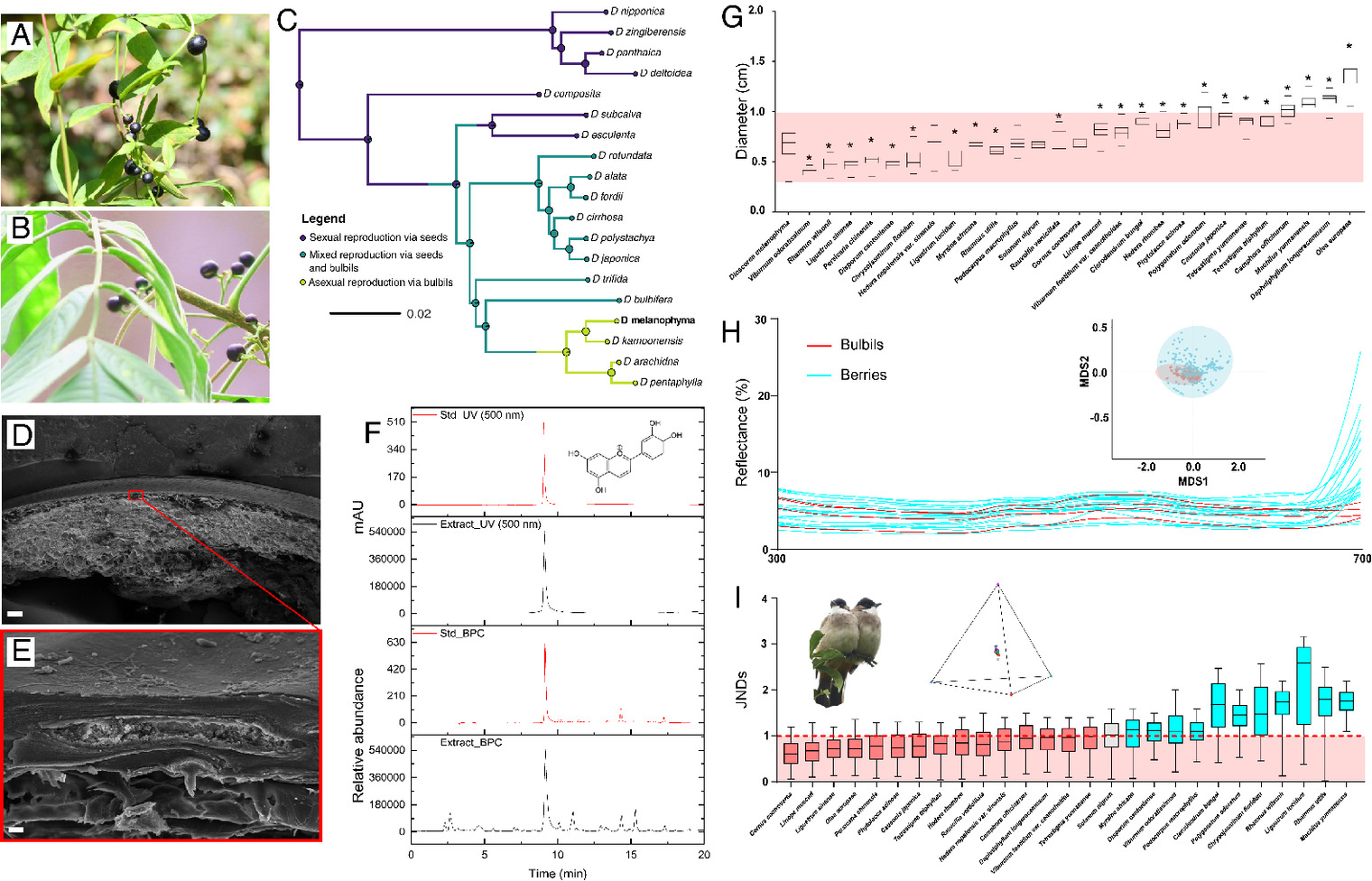 自然界中,大部分植物通过开花结果、产生种子来繁衍后代,种子靠风、水、动物等传播到远方。但也有少数植物失去了这种有性繁殖的能力,只能通过无性繁殖——比如通过珠芽来“复制”自己。然而,这些克隆后代往往只能落在母株附近,面临生存空间和资源竞争的压力。那么,这些植物如何突破这种“走不远”的困境呢? 黑珠芽薯蓣(Dioscorea melanophyma)是一种分布于中国西南山区多年生藤本植物。这一物种就面临着有性繁殖丢失的情况,仅依靠珠芽繁殖的情况。有趣的是,它的珠芽黝黑光亮,形态上与黑色浆果高度相似,甚至在标本中常被误判为果实。对此,我们猜测,珠芽是否通过模拟黑色浆果,以达到其被远距离传播的目的。 为验证这一猜想,中国科学院昆明植物研究所陈高研究团队开展了系统研究。通过对比珠芽与多种同域浆果的外形特征,发现这种珠芽的大小变化范围很广,能模仿多种浆果的尺寸,吸引不同体型的鸟类。更重要的是,在鸟类的视觉模型下,珠芽的反射光谱与黑色浆果几乎完全重叠——也就是说,在鸟看来,这就是浆果。扫描电子显微镜和化学分析进一步表明,珠芽表面的黑色来源于单层表皮细胞中的木樨黄定(luteolinidin)。
