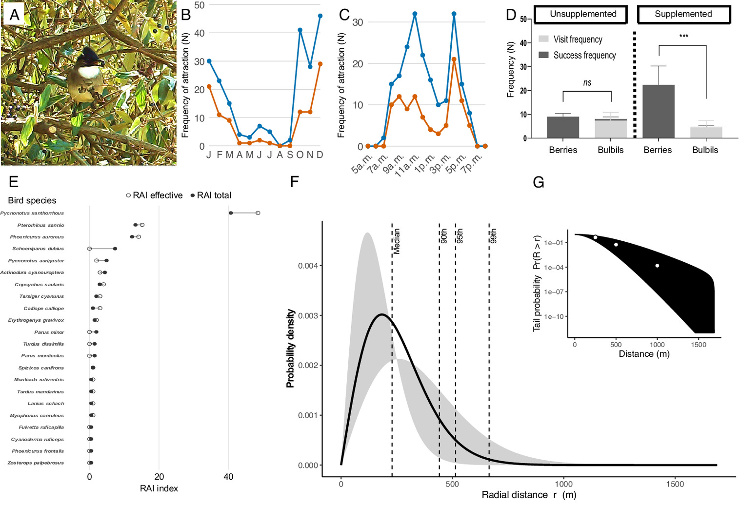 图1 A-B珠芽与相似的浆果;C黑珠芽薯蓣在薯蓣属系统发育树中的位置;D-F珠芽表皮结构与色素;G-I珠芽对浆果的模拟。 为求证珠芽的访问者,研究团队通过触发式红外相机进行了长达3年的野外监测。结果记录到22种雀形目鸟类对珠芽进行访问,黄臀鹎(Pycnonotus xanthorrhous)是其中最常见的。鸟类访问具有明显的季节性,主要发生在10月至次年2月。在天然浆果稀缺的季节,珠芽通过“替代效应”成功吸引鸟类关注,但移除率并不高(4.91%)。同时,实验室实验也表明,鸟类会在食物稀缺时主动取食珠芽,当浆果丰富时仍会优先选择浆果。 为评估珠芽经鸟类消化后的存活能力,团队通过饲喂实验发现,珠芽在鸟类消化道中的平均滞留时间为24.30±8.94分钟,且消化率极低(仅0.96%),绝大部分珠芽能被完整排出。播种实验进一步证明,经鸟类消化后的珠芽发芽率(86.50%)与未消化的对照组(92.06%)无显著差异,表明其活力未受影响。 另外,研究团队通过数学模型推算出,鸟类扩散珠芽的距离中位数约为230米,最远可实现750米以上的长距离扩散。这一距离不亚于某些鸟类传播的真正浆果植物,完全打破了无性繁殖“走不远”的困境。