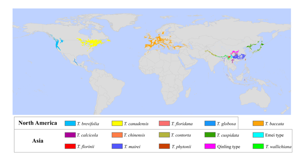 图2红豆杉属植物的地理分布图,其中北美洲4种,欧洲1种,亚洲10种(中国全产)