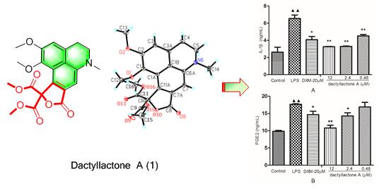 云南特色药材中新颖异喹啉生物碱结构及药理活性系列新进展 文章来源:植物化学与西部植物资源持续利用国家重点实验室 | 发布时间:2018-05-31 | 作者:王蓓 | 浏览次数: | 【打印】 【关闭】 自19世纪初德国科学家F.W. Sertürner从鸦片中分离出第一个异喹啉生物碱吗啡(morphine)以来,天然异喹啉生物碱及其衍生物因其结构复杂和生理活性广泛且显著,成为天然药物研究者追逐的热点之一,并一直在植物药开发中占据重要地位。植物化学与西部植物资源持续利用国家重点实验室云南特色植物资源的利用与开发团队长期致力于药用植物中新颖生物碱结构、功能及新药创制研究。最近,在异喹啉生物碱的新颖结构和活性研究上取得一系列新进展。 1. 紫金龙(Dactylicapnos scandens)作为富含异喹啉生物碱的云南省著名习用药材,广泛用于抗炎、镇痛。前期,研究者从紫金龙中开发了抗肾上腺素能及镇痛的上市药物盐酸异可立定片和近视乐眼药水。最近,研究组王蓓博士与合作伙伴从紫金龙药材中发现一个新型阿朴啡生物碱dactyllactone A,该化合物拥有独特的偕二甲酯基取代的苯并呋喃内酯骨架,为8,9;11,11a双重断裂重组的阿朴啡型结构。初步药理研究表明:与对照组地塞米松(20.0μM)比较, dactyllactone A 在2.4-12 μM的浓度下对 LPS 刺激 RAW264.7 细胞释放的炎症因子IL-1β 和PGE2具有更好的抑制作用,且呈现量效依赖关系。研究结果丰富了阿朴啡型异喹啉生物碱的多样性,并为天然非甾体抗炎先导化合物的发现提供了可能。上述研究成果以 “Anti-Inflammatory Isoquinoline with Bis-seco-aporphine Skeleton from Dactylicapnos scandens” 为题发表在Organic Letters (2018, 20, 1647?1650. DOI: 10.1021/acs.orglett.8b00400)上。