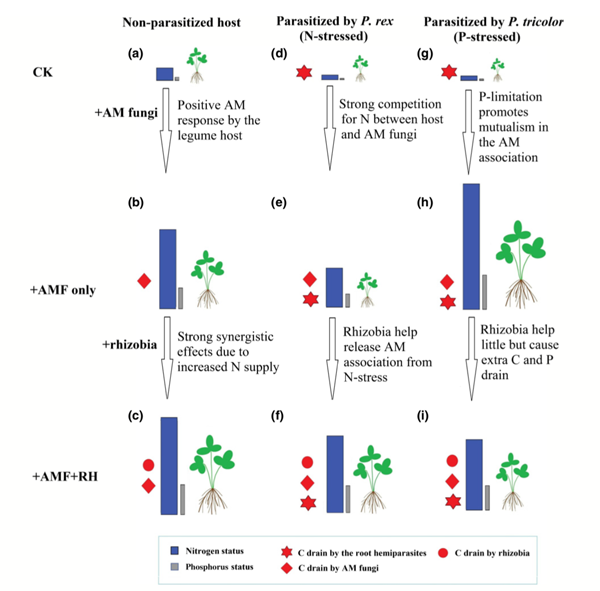 物种互作是影响生物多样性形成和维持的关键过程之一。了解特定生态系统中物种互作关系和调控过程,对解析生物多样性形成和维持机制,进而高效保护生物多样性有重要指导意义。在物种间复杂多样的互作关系中,养分获取往往是互作的核心。植物在适应环境的过程中进化出了多种养分吸收策略,其中与土壤共生微生物如丛枝菌根(AM)真菌建立共生关系,以提高对磷等养分的吸收效率,是多种植物的重要养分吸收策略。与之相反,寄生植物通过吸器直接从其它植物获取养分,常削弱寄主植物长势、降低寄主生产力。鉴于养分流失是寄生植物对寄主造成危害的主要原因之一,而土壤中的共生微生物通常可以提高寄主植物的养分吸收和利用水平,推测当寄生植物和土壤共生微生物同时存在时,土壤共生微生物可缓解寄主植物遭受的寄生危害。然而,尽管寄生植物与土壤共生微生物分布非常广泛,两个类群在多数陆地生态系统中同时存在,且均对所在生态系统中生物多样性形成及维持有重要影响,但关于土壤共生微生物对寄生植物及其寄主互作过程的影响研究十分有限。这在一定程度上限制了对相关生态过程的全面了解和认识。 中国科学院昆明植物研究所特色观赏植物新品种选育与产业化示范团队李爱荣博士带领的根际过程与植物保育研究组,长期致力于根部半寄生植物根际生物互作过程研究,先后解析了AM真菌与几种马先蒿属根部半寄生植物及其禾草类寄主的互作关系,发现接种AM真菌可显著抑制马先蒿生长发育。然而,由于马先蒿的禾草类寄主对接种AM真菌缺乏明显生长反应,土壤共生微生物如何通过影响寄主生长发育调节马先蒿与寄主的互作关系仍有许多未解之谜。 豆类也是马先蒿的较优寄主,但不同于禾草类寄主,豆类寄主可与AM真菌和根瘤菌建立三重共生关系,且接种AM真菌和根瘤菌常可显著提升植株养分吸收水平和生物量。在野外条件下,豆类寄主对马先蒿寄生的耐受能力常高于禾草类寄主,推测菌豆共生体在缓解马先蒿对豆类寄主的寄生危害中发挥重要作用。AM真菌和根瘤菌对寄主养分吸收的贡献不同,自身生长发育的养分需求也存在明显差异;而不同马先蒿的养分需求及对寄主的养分胁迫也存在明显种间差异。因此,探讨菌豆共生体对养分需求不同的马先蒿寄生胁迫的响应,有助于了解多重互作中生物间特异的养分调节过程,对认识土壤共生微生物如何调控根部半寄生植物与寄主互作关系有重要意义。 昆明植物所李爱荣研究组在前期研究的基础上,选择大王马先蒿(氮需求较高)和三色马先蒿(磷需求较高)为研究对象,通过盆栽接种试验分析了AM真菌和根瘤菌在缓解马先蒿对豆类寄主寄生危害中的作用。结果显示,接种AM真菌和根瘤菌可显著缓解两种马先蒿对白三叶的寄生危害,各生物间表现出强烈的多重互作,生长表现和参与互作的生物养分需求特征密切相关。该研究首次探讨了AM真菌和根瘤菌对根部半寄生植物与寄主互作的交互影响,并基于生物养分需求特征解析了效果相反的多种生物共同作用于同一寄主时的多重互作过程,进一步阐明了土壤共生微生物在调控根部半寄生植物与寄主互作关系中的重要作用。研究结果以“A neglected alliance in battles against parasitic plants: arbuscular mycorrhizal and rhizobial symbioses alleviate damage to a legume host by root hemiparasitic Pedicularis species”为题发表于植物学领域主流期刊New Phytologist。隋晓琳博士为论文第一作者,李爱荣博士为通讯作者。该研究得到了国家自然科学基金项目(31400440、31370512和U1303201)、云南省应用基础研究计划项目(2016FB059)、中国科学院青年创新促进会以及云南省中青年学术和技术带头人后备人才项目(2014HB047)支持。