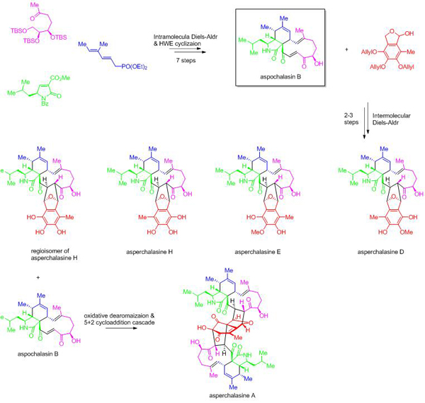 细胞松弛素aspechalasine A的首次全合成研究 文章来源:植物化学与西部植物资源持续利用国家重点实验室 | 发布时间:2018-08-27 | 作者:丁一鸣 | 浏览次数: | 【打印】 【关闭】 结构复杂多样的天然产物是现代药物发现的重要源泉,然而由于大部分天然产物自然来源极其有限,难以对其化学结构、生物及药理活性、生物合成途径开展深入研究,因此,如何简洁、高效地大量获得天然产物及其类似物成为天然产物化学、药物化学、有机化学和化学生物学的重要研究领域。 细胞松弛素是一大类真菌代谢产物,目前该家族已分离得到300多个成员。它们不仅具有复杂且迷人的化学结构,同时也有着广泛的生物活性,其中包括免疫调节,细胞毒性和杀线虫活性。这一类天然产物分子早已引起了多位合成大师的广泛关注,并且已报道了许多杰出的工作,如早期的E. J. Thomas, G. Stork, E. Vedejs, B. M. Trost及近期的A. G. Myer等人都发展了非常漂亮的全合成路线来制备这类天然产物以研究其药理活性。近年来,华中科技大学张勇慧课题组陆续分离得到了一系列细胞松弛素类的多聚体如asperchalasines A-H等,其中结构最为复杂的asperchalasine A从生源合成的角度来看,被认为是由两分子aspochalasin B和一分子epicoccine杂合而成,分子中含有20个手性中心和5/6/11/5/5/6/5/11/6/5十个环系,结构十分复杂;在生物活性方面,asperchalasine A对肿瘤细胞株在G1周期具有显著的抑制活性,而对正常细胞株几乎无影响,具有潜在的药物研究价值。该类分子一经发布便引起国内外多位合成化学家的关注。 近期,中国科学院昆明植物研究所天然产物合成化学团队,以最长线性步骤16-17步,完成了Asperchalasine A等分子的首次不对称全合成。在该工作中,利用分子间Diels-Alder反应及分子内Horner–Wadsworth–Emmons大环化等反应,克级制备了这一工作中的关键天然产物aspochalasin B。由aspochalasin B出发再通过分子间的Diels-Alder反应发散性合成了asperchalasines D、E和H,随后利用仿生合成策略实现了分子间立体选择性的5+2环化加成反应最终实现了asperchalasine A分子的首次全合成。 该工作对揭示asperchalasine A类多聚体的生源合成路径具有重要的参考价值,也对该分子进一步药理活性的研究提供了重要基础。该工作近期以“Total Synthesis of Asperchalasines A, D, E and H”为题发表在国际顶级化学期刊《德国应用化学》(Angewandte Chemie International Edition)上,博士生龙先文和丁一鸣为共同第一作者,邓军研究员为论文通讯作者,中国科学院昆明植物研究所为唯一单位。