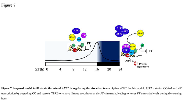 植物响应季节变化的开花时间是通过植物对日照长度变化(光周期)的感知来完成的。在拟南芥中,长日照条件诱导开花启动因子Flowering Locus T(FT)的表达来加速植物开花。光周期条件对FT的激活主要依赖于转录因子CONSTANS(CO)的活性,对CO的转录水平、蛋白质稳定性以及生物钟的调控是植物能够响应光周期并诱导植物成花的关键机制。ABI5结合蛋白2(ABI5-BINDING PROTEIN 2, AFP2)通过促进拟南芥种子萌发过程中ABI5的降解负调控脱落酸(ABA)信号。然而,AFP2在调节植物开花时间中的作用仍不清楚。 近日,中国科学院昆明植物研究所植物基因组演化与基因功能发掘团队杨永平研究员团队与上海大学胡向阳教授的团队合作研究发现,在长日照条件下过表达AFP2的转基因拟南芥植株的开花时间显著延迟,同时伴随着CO表达水平降低。相反,afp2缺失突变体开花提前,且CO表达量升高。以上结果表明,AFP2通过调控CO以负调控光周期依赖的开花时间。进一步发现, AFP2蛋白的C末端能够与CO存在相互作用,而其N末端的EAR基序与转录辅阻遏物TOPLESS相关蛋白2(TPR2)存在相互作用。因此,AFP2蛋白同时连接CO和TPR2进而形成CO-AFP2-TPR2复合物。生化和遗传分析显示AFP2具有在夜间达到峰值的昼夜表达节律,并且AFP2在夜间介导CO降解。AFP2通过与TPR2的相互作用以募集组蛋白去乙酰化酶(HDAC)至FT基因启动子上来降低FT染色质组蛋白的乙酰化水平进而抑制夜间FT的转录。本研究结果揭示了CO-AFP2-TPR2复合物通过调控CO蛋白的稳定性以及FT染色质的组蛋白去乙酰化水平来调节植物响应光周期开花的分子机制。 研究成果“ABI5-BINDING PROTEIN 2 Coordinates CONSTANS to Delay Flowering by Recruiting the Transcriptional Corepressor TPR2”为题在线发表于Plant Physiology上。中国科学院昆明植物研究所博士研究生常贯晓为该论文第一作者,杨永平研究员和胡向阳教授为共同通讯作者。该研究得到了国家自然科学基金项目、云南省应用基础研究计划项目等经费的支持。