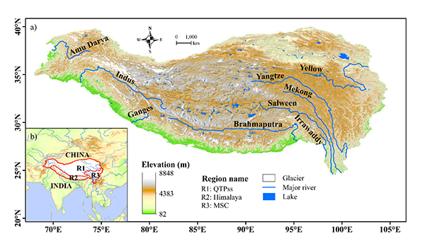 图1 第三极的地貌特征(a)及位置(b)。第三极包括R1: QTPss,狭义的青藏高原;R2: Himalaya,喜马拉雅山地;R3: MSC,中国西南山地