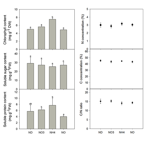 不同氮条件对茶树叶片中叶绿体、可溶性糖和蛋白质,总碳(C)和总氮(N)含量以及C/N比的影响