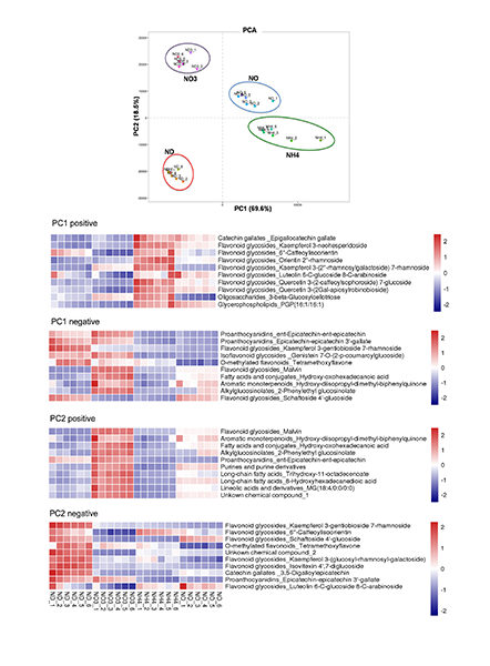 基于LC-MS/MS的不同氮条件下茶树叶片中所有代谢物主成分分析以及与PC1和PC2正负相关的排名前10种代谢物的热图分析