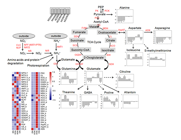 茶是中国的“国饮”,也是世界公认的最大天然非酒精饮料。茶起源于中国,中国是世界上最早发现和利用茶树的国家,也是世界主要产茶国之一。茶产业已经成为我国国内消费和出口创汇的重要经济支柱之一。在实际生产中,合理使用氮肥不仅能够增加茶叶的产量,而且能够提高茶叶中氨基酸、嘌呤类生物碱等化合物的含量,改善茶叶品质。前人研究表明,不同氮水平和氮形态(铵态氮,NH4+-N;硝态氮,NO3--N)对茶叶中代谢物的积累模式的影响具有显著的差异,但是其中的调控机理仍不清楚。 中国科学院昆明植物研究所植物种质资源、基因组学与生物信息学团队高立志研究组以一年生云南大叶茶苗(Camellia sinensis var. assamica)为研究材料,采用代谢组学和转录组学相结合的技术手段,对不同氮水平和氮形态下生长一定时期的茶苗的生理指标、代谢物积累和基因表达模式进行了深入的研究分析。研究发现,不同氮条件处理下,茶叶中黄酮类物质的积累及其相关基因的表达模式都表现出最为显著的差异。缺氮条件下(ND),茶树大量积累黄酮类物质,研究组推测这与ND中黄酮类物质合成基因,包括F3H, FNS, UFGT, bHLH35和bHLH36的高表达密切相关。与缺氮茶苗相比,提供氮元素(NO3, NH4 和NO)的茶苗叶片中显著富集脯氨酸、茶氨酸和谷氨酰胺,尤其是在铵态氮处理的茶苗叶片中最为明显。进一步的分析发现,作为耐铵和喜铵植物,在铵态氮处理的条件下,茶树通过高效的氮吸收、运输和同化以及活跃的蛋白质降解过程,大量富集茶叶风味物质茶氨酸以适应过量的铵离子,避免伤害。该研究为全面揭示不同氮水平和氮形态对茶叶中风味物质积累模式的调控机理奠定了重要基础。 该研究成果以“Metabolomics and Transcriptomics Analyses Reveal NitrogenInfluences on the Accumulation of Flavonoids and Amino Acids in Young Shoots of Tea Plant (Camellia sinensis L.) Associated with Tea Flavor”为题,发表于国际著名期刊Journal of Agricultural and Food Chemistry。该研究得到了国家自然科学基金、云南省应用基础研究计划、云南省创新团队等项目的支持。