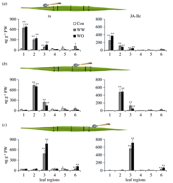 图1. 玉米叶片中JA和JA-Ile对机械损伤及模拟粘虫取食的积累响应 (责任编辑:李雪) |