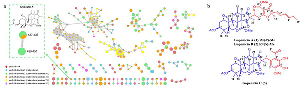 图-1. Penicillium sp. sh18分子网络及isopenicins A–C结构式
