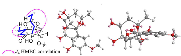 图-2. Isopenicin A抑制Wnt信号通路 2.利用OSMAC策略发现一对新颖的二苯并-α-吡喃酮对映异构体 通过LC-UV筛选发现来自于黄花香茶菜(I. sculponeatus)中的一株内生链格孢菌(Alternaria sp. hh930)具有较为丰富的次生代谢产物,随后通过利用OSMAC(One strain-many compounds)研究策略优化其发酵条件,从其大米培养基中发现了一对具有二环氧笼状结构的二苯并-α-吡喃酮对映异构体,(+)-和(-)-alternarilactone A(图-3)。该化合物的核心片段由于具有连续季碳且出现了多个具有欺骗性的HMBC信号,如出现了罕见的C-H四键相关(4JCH),因此对其结构解析带来了不小挑战。最终研究组通过利用量子化学计算NMR数据结合DP4+可能性分析及X-单晶衍射分析确定了其结构,同时通过手性色谱柱拆分结合量子化学计算电子圆二色谱(ECD)从而确定了其绝对构型。研究组还利用量子化学计算耦合常数证实了出现的4JCH 耦合是由于“W”耦合(“W” couplings)会显著增加4JCH的耦合常数导致的(图-4)。另外,多种活性模型筛选发现,(+)-和(-)-alternarilactone A具有一定的抑制皮质酮诱导的PC12细胞凋亡的活性。 以上研究成果以“(+)- and (-)-Alternarilactone A: Enantiomers with a Diepoxy-Cage-like Scaffold from an Endophytic Alternaria sp.”为题在线发表在Journal of Natural Products(DOI: 10.1021/acs.jnatprod.8b00571)。唐健维博士生为该文章的第一作者,普诺·白玛丹增研究员为该文章的通讯作者。