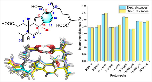 昆明植物所在“一科一属”植物新颖次生代谢产物研究中取得新进展 文章来源:植物化学与西部植物资源持续利用国家重点实验室 | 发布时间:2019-04-18 | 作者:胡坤 | 浏览次数: | 【打印】 【关闭】 结构新颖天然产物的发现往往伴随着结构确证方面的挑战,同时,由于化合物含量、物化性质等因素,适合于单晶X-射线衍射实验的晶体常不易获得。因而,在近期针对重要药用植物类群——五味子科和香茶菜属(“一科一属”)植物新颖次生代谢产物的研究中,中国科学院昆明植物研究所重要类群植物化学及功能研究团队多次将量子化学计算(核磁共振参数与手性光学性质)这一工具运用于化合物构造与构型的确定中。此外,为进一步佐证由量子化学计算所确定的化学结构,研究团队又引入了量化质子间距离分析方法(quantitative interproton distance analysis),该方法此前主要被用以进行构象分析(如J. Am. Chem. Soc., 1995, 117, 1027–1033,即NAMFIS方法),而Craig P. Butts等研究者则将该方法运用于天然产物的结构解析(如J. Org. Chem., 2012, 77, 1489–1496;Nature, 2017, 547, 436–440等)。针对香茶菜属植物二萜与五味子科植物三萜的研究则进一步表明,量子化学计算与量化质子间距离分析方法的联用,在天然产物刚性分子与中等柔性分子的结构确证中具有较大的应用价值。以下为几个具体研究实例: 1. 黑老虎根中含芳环新颖三萜的发现: 黑老虎(K. coccinea)是一种重要的传统中草药,其常被用于治疗风湿性关节炎、产后腹痛淤血等病症。在本研究组此前对黑老虎的研究中,已发现6种新颖的三萜骨架,它们生源上均来自于羊毛甾烷型三萜。值得一提的是,以往对于黑老虎的研究均针对其茎叶,而在本研究中,研究团队幸运地获得了黑老虎的根,并在对该样品的化学成分研究中发现了3个结构新颖的三萜类化合物,neokadcoccitanes A–C(1–3)。其中,化合物1具有14(13→12):28(14→8)-二迁移-3,4-裂环-羊毛甾烷型三萜新颖骨架,且D环芳构化而形成四取代苯环(已报道的羊毛甾烷三萜中,仅有三个化合物骨架结构中存在苯环,且均位于B环),化合物2和3分别具有新颖的25,26,27-三降-14(13→12)-迁移-3,4-裂环-羊毛甾烷与30-降-14(13→12)-迁移-3,4-裂环-羊毛甾烷型骨架。由于孤立手性中心的存在、NOESY相关缺失或具有误导性、氢谱信号重叠等原因,化合物1的立体构型难以确定、且存在8种可能的立体异构体(1a–1h),尽管量子化学NMR化学位移计算结合DP4+分析支持1e为正确结构,但无法给出确定无疑的结论。进而,通过对其中4种立体异构体进行量化质子间距离分析,使1e的正确性得到了进一步佐证。对以上三个化合物的生物活性筛选发现,化合物1对胶质诱导的家兔血小板聚集具有抑制作用。以上研究成果以“Synergistic use of NMR computation and quantitative interproton distance analysis in the structural determination of neokadcoccitane A, a rearranged triterpenoid featuring an aromatic ring D from Kadsura coccinea”为题发表于Organic Chemistry Frontiers杂志。徐厚朝硕士生和胡坤博士为该文章的并列第一作者,普诺·白玛丹增研究员为该文章的通讯作者。
