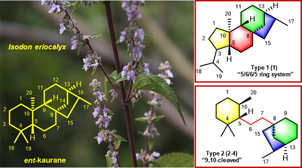 2. 毛萼香茶菜中新颖二萜的发现: 毛萼香茶菜(I. eriocalyx)为广泛分布于我国西南地区的多年生草本或灌木,在民间多被用以治疗咽喉痛、流感等。本研究组在此前对该种植物的研究中,已发现若干个“明星分子”,如eriocalyxin B(Acta Botanica Yunnanica, 1982, 4, 407–411)、maoecrystal V(Org. Lett., 2004, 6, 4327–4330)等。在本次对采集自玉溪澄江县的毛萼香茶菜的研究中,发现了一个新颖的具有4,5-裂环-3,5-环合-7,20-环氧-对映-贝壳杉烷型二萜骨架的化合物,maoeriocalysin A(1),该化合物具有独特的5/6/6/5环系;此外,还发现了三个罕见的9,10-裂环-对映贝壳杉烷型二萜,maoeriocalysins B–D(2–4),其中,化合物4由于C-1/C-7与C-7/C-20间各自形成氧桥而使其呈现出独特的笼状结构。化合物1和4的化学结构均通过量子化学NMR化学位移计算及量化质子间距离分析得到确证。对以上化合物进行活性筛选后发现,化合物2具有一定的乙酰胆碱酯酶抑制活性,并对二磷酸腺苷(ADP)与花生四烯酸(AA)诱导的家兔血小板聚集具有一定的抑制作用。以上研究成果以“Maoeriocalysins A–D, four novel ent-kaurane diterpenoids from Isodon eriocalyx and their structure determination utilizing quantum chemical calculation in conjunction with quantitative interproton distance analysis”为题发表于Organic Chemistry Frontiers杂志。杨谦博士生和胡坤博士为该文章的并列第一作者,普诺·白玛丹增研究员为该文章的通讯作者。