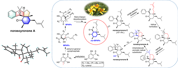 图1. Garsubelone A和B的结构以及生源途径推断 硕士研究生胡雅丽在金丝桃属黄海棠组黄海棠(Hypericum ascyron)的研究中发现了一系列核心结构为简单环己烷的PPAP类化合物(nor-BPAP)。前期文献报道的该类化合物有18个,但由于其结构简单而未受到足够的重视;2014年文献提出该类化合物可能是桥环型PPAP通过Retro-Claisen以及脱羧反应而来(Org. Lett. 2014, 16, 3448–3451)。本研究发现这类母核结构貌似简单的化合物侧链可进一步经由[4 + 2]自由基环化,形成具有6/6/5/6复杂环系的PPAP类衍生物——Norascyronones A和B。同时发现其中部分化合物具有较好的体外细胞毒活性。目前上述研究成果以“Norascyronones A and B, 2,3,4-nor-Polycyclic Polyprenylated Acylphloroglucinols from Hypericum ascyron”为题发表在Organic Letters, (2019, 21, 1007–1010; DOI: 10.1021/acs.orglett.8b04022)上。