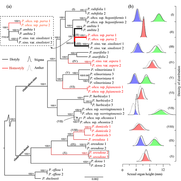 昆明植物所在异型花柱植物交配系统演化及其生态和遗传效应研究中取得重要进展 文章来源:中国西南野生生物种质资源库 | 发布时间:2019-05-21 | 作者:周伟,钟莉 | 浏览次数: | 【打印】 【关闭】 被子植物的花形态和结构所呈现的高度多样化令人叹为观止,也激发了人们对其奥秘的无限探索。早在十八至十九世纪,以科尔鲁特(K.lreuter J.G.,1733-1806)、施普伦格(Sprengel C.K.,1750-1816)以及奈特(Knight T.A.,1759-1838)等为代表的自然学家通过细微的观察对每个基本花部结构的功能做了最朴素的思辩,由此奠定了“花生物学”的雏形。直到1876年,达尔文出版了《植物界的异花授粉和自花授粉》,开创性地提出异交的自然选择优势理论,指出花各部分结构协同功能均服务于促进异交的过程(Nature…abhors perpetual self-fertilization — Charles Darwin 1876)。直到二十世纪上半叶,随着理论进化遗传学的发展,学者们逐渐意识到,自交的谱系/物种在特定条件下也可能受到自然选择的青睐,尤其是当自交过程中繁殖保障优势(reproductive assurance)和基因的自动传递优势(transmission advantage)能够抵消近交衰退导致的适合度折损,并且尚有赢余的情形下,自交有可能受到选择。那么,在自然界中自交个体能否成功侵入异交群体并有效保存下来?幸存的自交谱系/物种是否面临遗传多样性的急剧减退?在遗传储备缩减的情形中,自交谱系/物种能否发育出具有适应性演化功能的自交综合征? 中国科学院昆明植物研究所植物多样性演化和生态适应团队王红研究组和植物多样性与基因组学团队李德铢研究组,与加拿大多伦多大学等合作,选取报春花属(Primula) 中异型花柱物种和同型花柱物种频繁出现的鄂报春组(section Obconicolisteri),利用异型花柱物种异交为主,而同型花柱物种通常以自交为主的特性,对该组内交配方式差异化的物种进行了系统发育基因组学、种群遗传学和繁殖性状演化综合研究,探讨其交配系统演化方向及其潜在的遗传学和生态学效应。研究表明,以鄂报春组为代表的报春花植物中,二型花柱为该类群祖征,而同型花柱则为衍征;二型花柱向同型花柱发生了多次的独立演变;种群遗传学分析不仅印证了系统学的结果,也表明衍生的同型花柱物种相对二型花柱祖先物种具有极高的自交率和极低的遗传多样性储备;繁殖性状的分析结果表明,所有独立起源的同型花柱物种中均出现明显的自交综合征发育信号,其中突出体现在花展示水平、雌雄功能隔离和雌雄繁殖资源分配等三个方面。该研究是异型花柱植物类群交配系统转变和自交综合征发育的第一个实证案例,解析植物交配系统从异交向自交转变的过程,及其潜在的种群遗传学效应和繁殖性状适应性演化规律,同时,从植物性系统演化的角度探讨了报春花属在喜马拉雅-横断山区的物种多样性发生和维持机制。 研究成果以 “ Phylogenomic analysis reveals multiple evolutionary origins of selfing from outcrossing in a lineage of heterostylous plants ” 为题在植物学领域主流期刊New Phytologist在线发表。博士研究生钟莉为论文第一作者,王红研究员和周伟副研究员为共同通讯作者。 该研究得到中国科学院战略性先导科技专项 (XDB31000000)、国家自然科学基金(31570384, 31770417)、国家自然科学基金-云南省联合重点基金(U1502261)、云南省云岭学者项目(YLXL20170001)和中国科学院“西部之光”等项目资助。