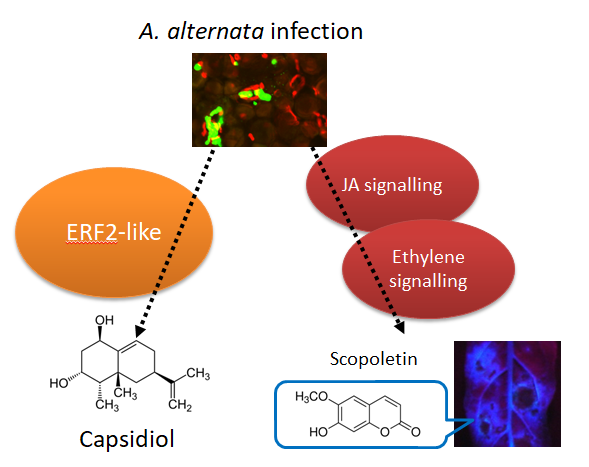 图:植物在感受到链格孢菌的入侵后,独立的启动了茉莉酸和乙烯依赖的香豆素类的植保素scopoletin和scopolin的防御反应,同时还启动了另一条ERF2-like的信号通路,调控了植保素capsidiol的生物合成。 (责任编辑:李雪)