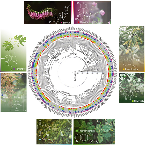 昆明植物所在植物系统学与植物化学交叉学科研究上取得重要进展 文章来源:中国科学院东亚植物多样性与生物地理学重点实验室 | 发布时间:2020-05-25 | 作者:张永增 | 浏览次数: | 【打印】 【关闭】 植物次生代谢产物是指植物体内普遍存在的生物代谢非必须的小分子化合物,具有重要的经济和药用价值。次生代谢产物是链接植物科学各分支和化学交叉学科的关键所在,是深入探讨植物系统发育的重要的化学证据。利用次生代谢产物的特征及分布规律来探讨植物多样性的起源、演化与适应机制,或是利用植物系统发育来探讨次生代谢产物在植物进化历程中形成和分布规律,是植物化学同植物系统学学科交叉新产生的进化生物学或化学生物学的前沿研究领域。 中科院昆明植物所青藏高原-喜马拉雅植物多样性形成与演变团队联合植物化学生物学团队、重要类群植物化学及功能研究团队、天然药物新药研发团队、活性天然产物发现与生物合成团队,以及中科院武汉植物园、美国密苏里植物园(Missouri Botanical Garden)、康奈尔大学(Cornell University)、欧柏林大学(Oberlin College)等研究了生物碱类、黄酮类、萜类、单宁类、酚酸类、醌类、甾体类、苯丙素类等八大次生代谢产物在种子植物生命之树(Tree of Life)中的分布特征及演化规律。 研究结果表明:1)种子植物437个科中,至少308个科有过植物化学成分研究报道。黄酮类和生物碱类是种子植物中占主导地位的代表性次生代谢产物,其它次生代谢产物在种子植物大的进化支系中的分布没有发现显著的规律,如萜类主要分布在裸子植物和菊支植物中,单宁类主要分布在蔷薇支植物中,而苯丙素类、醌类、酚酸类和甾体类在种子植物中呈现出随机分布特征;2)次生代谢产物在生命之树中的系统发育信号普遍不高,趋于随机分布,该结果表明除了固有的遗传因素外,多次起源(包括趋同进化)、生物之间相互作用以及环境是导致次生代谢产物复杂多样和近随机分布的重要原因;3)八类次生代谢产物中,除甾体类以外,其他七类均在生命之树的不同支系上呈现了一定的系统发育信号或分布规律,除了可为系统发育提供化学证据外,对寻找或发现特定化合物有着重要潜力和应用前景;4)从起源上看,大多数次生代谢产物在种子植物的祖先类群中便已出现,并随着植物的进化而急剧多样化,如黄酮类、苯丙素类等在植物登陆时就已出现,为植物适应陆地环境奠定了化学基础,但其多样性主要还是在被子植物的进化历程中适应环境、防御掠食者和病原体、或为化感剂、或作为传粉和果实扩散的诱导成分等过程中不断丰富和多样化的;特别是在白垩纪以后,次生代谢产物的多样性与昆虫、哺乳动物和鸟类多样化过程具有紧密关系,如柱头的出现以及芳香萜由利己素到利它素的转变,是促使食植性昆虫转变为传粉昆虫的重要原因。因此,研究从时间线上探究次生代谢产物的起源、分布及进化规律,为我们呈现出一幅从植物次生代谢产物角度编绘的,从适应到辐射发展,再到多样化以及相互制约、协同进化的争相斗艳的生命画卷。 该研究结果以“Phylogenetic patterns suggest frequent multiple origins of secondary metabolites across the seed plant “tree of life”为题发表在National Science Review杂志上。该研究得到了国家自然科学基金重大项目(31590823)、国家重点研发计划(2017YFC0505200)和中国科学院先导A项目(XDA 20050203)的资助。