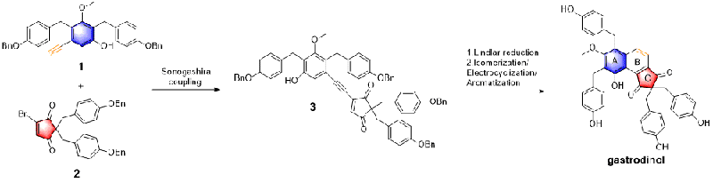Figure 1 研究人员首先通过F-C烷基化、选择性地甲基化和Sonogashira偶联等10步反应高效的合成了片段1;利用Knoevenagel反应和溴代等4步反应制备了片段2。最后利用汇聚式合成的策略,片段1和2经过Sonogashira 偶联得到中间体3,然后经过林德拉还原将炔还原为反式的双键。反式双键在光照的条件下(Hg lamp, 500W)首先异构化为顺式双键,紧接着关环和芳构化成功的构建了B环,最后脱去苄基顺利地得到了天然产物gastrodinol (200mg), 为进一步的药理活性实验提供了足够的原料保证。