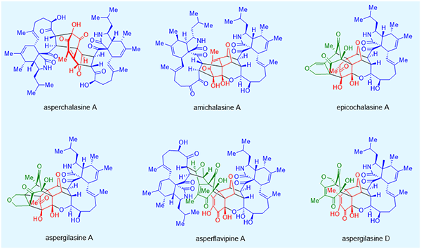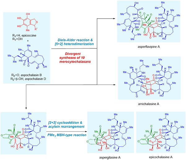 昆明植物所在细胞松弛素多聚体的系列全合成研究中取得进展 文章来源:植物化学与西部植物资源持续利用国家重点实验室 | 发布时间:2020-12-21 | 作者:梁弘 | 浏览次数: | 【打印】 【关闭】 结构复杂多样的天然产物一直以来都是小分子药物发现的重要来源,尽管天然产物结构丰富多样但其自然来源往往十分有限,难以对其化学性质及生物活性开展深入研究,因此,如何简洁、高效、大量地获得具有特定结构天然产物及其类似物成为天然产物化学合成、生物合成及有机合成方法学的重要研究内容。 细胞松弛素是一大类由聚酮和氨基酸杂合而成,结构新颖,活性显著的真菌次生代谢产物。近年来国内植物化学家陆续分离获得了一系列结构复杂多样、具有一定抗肿瘤活性的细胞松弛素类多聚体,吸引了国内外众多合成化学家的关注。2018中国科学院昆明植物研究所天然产物合成化学团队以仿生邻苯醌[5+2]杂二聚反应为关键反应完成了该家族第一例细胞松弛素三聚体asperchalasine A的全合成 (Angew. Chem. Int. Ed. 2018, 57, 14221-14224)。