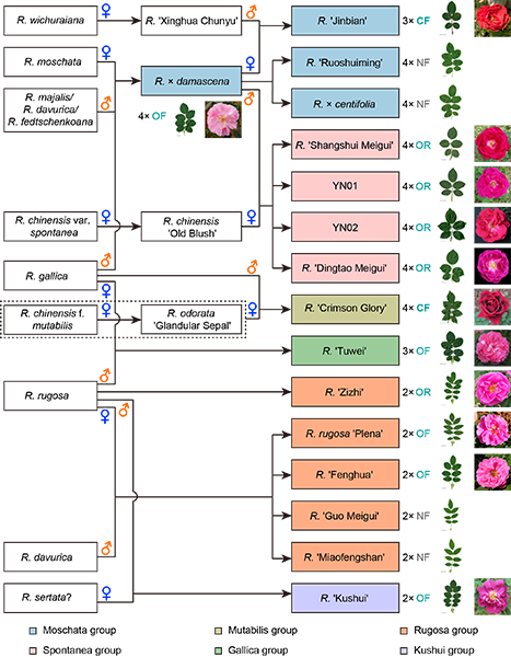 昆明植物所提出中国主栽食用玫瑰的“复杂网状起源”假说 文章来源:中国科学院东亚植物多样性与生物地理学重点实验室 | 发布时间:2022-01-17 | 作者:崔卫华 | 浏览次数: | 【打印】 【关闭】 玫瑰(rose)在世界和中国的历史长河中有不可替代的宗教和文化地位。玫瑰兼具园林观赏和药食两用等功能,为“四大切花”之首。我国具有悠久的玫瑰利用历史,早在汉代我国就有了玫瑰应用的文字记载,至唐宋年间已育成连续开花的玫瑰品种,元明时期‘荼薇玫瑰’被用于酿酒行业中,而云南人在明清时期已将玫瑰用于茶饮、玫瑰酱、玫瑰饼等制作。建国后特别是改革开放以来,食用玫瑰产业蓬勃发展,形成了山东、甘肃、云南等多个食用玫瑰主产区;云南已形成以“鲜花饼”为主的食用玫瑰产业,2017年鲜花饼产值已超20亿元,并拥有约6万亩的种植规模。中国主栽食用玫瑰主要有‘重瓣红玫瑰’(Rosa rugosa 'Plena')、‘紫枝玫瑰’、‘丰花玫瑰’、‘墨红玫瑰’、‘滇红玫瑰’、‘八街玫瑰’、‘苦水玫瑰’、‘荼薇玫瑰’、‘金边玫瑰’、‘大马士革’(Rosa × damascena)和‘千叶玫瑰’(Rosa × centifolia)等。2010年3月9日国家食品安全标准与监测评估司明确规定‘重瓣红玫瑰’可作为普通食品资源进行生产经营。然而,各地食用玫瑰品种形态各异,多数与野生玫瑰(Rosa rugosa L.)及‘重瓣红玫瑰’的关系不清,起源模糊,在很大程度上限制了食用玫瑰产业的规范发展,造成潜在食品安全风险,且不利于品种改良。同时,除山东主产的平阴玫瑰外,多不具自主品种权,且几乎不具连续开花习性,严重影响了中国食用玫瑰产业的可持续发展。 中国科学院昆明植物研究所“植物分子遗传与适应”研究组围绕植物开花习性及植物与环境互作模式的多样性、机理与演化开展工作。前期课题组构建了‘无刺光叶蔷薇’染色体水平高质量基因组(Zhong et al. 2021 National Science Review),解析了月季皮刺的遗传调控机制,提出了发育早期的皮刺具储水功能的假设,为月季生物学研究和新种质的培育奠定了基础。针对中国主栽食用玫瑰种质的遗传关系不清且缺乏自主优良品种的问题,课题组收集了16个国内主栽食用玫瑰品系,通过叶绿体基因组重建和将核糖体rDNA基因区的ITS1/2序列进行分型等方法,构建了迄今为止涵盖蔷薇属所有主要分类群且最稳定的质体基因组系统树(“To the best of my knowledge, this is the first time I see a study that integrate as many whole chloroplast genome sequences to build a phylogenetic study in Rosa”),追溯了中国食用玫瑰种质间的遗传关系及其可能野生近缘种。 研究结果表明,可能有6个野生种作为母本参与了中国主栽食用玫瑰种质的形成。麝香蔷薇(Rosa moschata Herrm.)为四倍体品种‘千叶玫瑰’、‘大马士革’、‘若水茗’和三倍体品种‘金边玫瑰’的共同母系祖先;云南本土品种YN01、YN02和‘商水玫瑰’、‘定陶玫瑰’均为四倍体,与中国古老月季‘月月粉’(Rosa chinensis 'Old Blush')拥有共同的母本祖先——单瓣月季花 (Rosa chinensis var. spontanea (Rehder & E.H. Wilson) T.T. Yu & T.C. Ku)。‘墨红玫瑰’与具有相同叶绿体基因组序列的‘花蝴蝶’(Rosa chinensis f. mutabilis (Correvon) Rehder)或‘腺萼香水月季’(Rosa odorata 'Glandular Sepal')共享母本祖先。‘荼薇玫瑰’的母本祖先为法国蔷薇(Rosa gallica L.)。‘重瓣红玫瑰’、‘紫枝玫瑰’、‘丰花玫瑰’、‘妙峰山玫瑰’和‘果玫瑰’的共同母本野生祖先为中国原产的野生玫瑰。‘苦水玫瑰’的母本祖先与其他食用玫瑰均不同,自成一系。 基于核糖体rDNA区ITS1/2的精细分型研究发现,至少9个野生种参与了现有主栽食用玫瑰品种的形成,野生玫瑰、‘大马士革’和法国蔷薇是参与多个食用玫瑰品种形成的主要贡献者。野生玫瑰参与了所有的二倍体食用玫瑰品种和‘荼薇玫瑰’的形成,而其它与‘大马士革’相关的品种没有发现野生玫瑰的ITS贡献。结合叶绿体基因组和ITS分型方法,团队提出了中国食用玫瑰种质复杂的网状起源模型(图1)。 团队还发现,现有主栽种质中仅‘金边玫瑰’和‘墨红玫瑰’具连续开花习性,YN01、YN02、‘商水玫瑰’、‘定陶玫瑰’和‘紫枝玫瑰’具有偶尔二次开花现象,其他种类均为一次开花品种。现有可连续开花或偶尔二次开花的食用玫瑰品种均与连续开花的中国古老月季有关。该研究将为食用玫瑰种质的安全评估、选择利用、品种改良等提供了重要的基础数据。团队使用二代数据成功组装样本ITS序列单倍型的方法,也将为ITS序列在亲本溯源、系统进化等方面的正确应用提供重要技术支持,相关技术已申请专利(202110640825.X)。 研究成果以“Complex and reticulate origin of edible roses (Rosa, Rosaceae) in China”为题在线发表于园艺学顶级期刊Horticulture Research上。博士研究生崔卫华为论文第一作者,胡金勇研究员和博士研究生蒋晓东为论文共同通讯作者。研究得到了云南省科技领军人才培养计划(2017HA014)、中国科学院B类战略性先导科技专项(XDB31000000)、中国科学院东亚植物多样性与生物地理学重点实验室、云南高端科技人才引进计划等项目支持。部分工作受云南省疾病预防控制中心、中国西南野生生物种质资源库贾艳霞、昆明植物园俞宏渊、吕元林、云南省农科院李淑斌、山东平阴玫瑰研究所孟宪水和云南省花卉技术培训推广中心王俊云等老师的协助与支