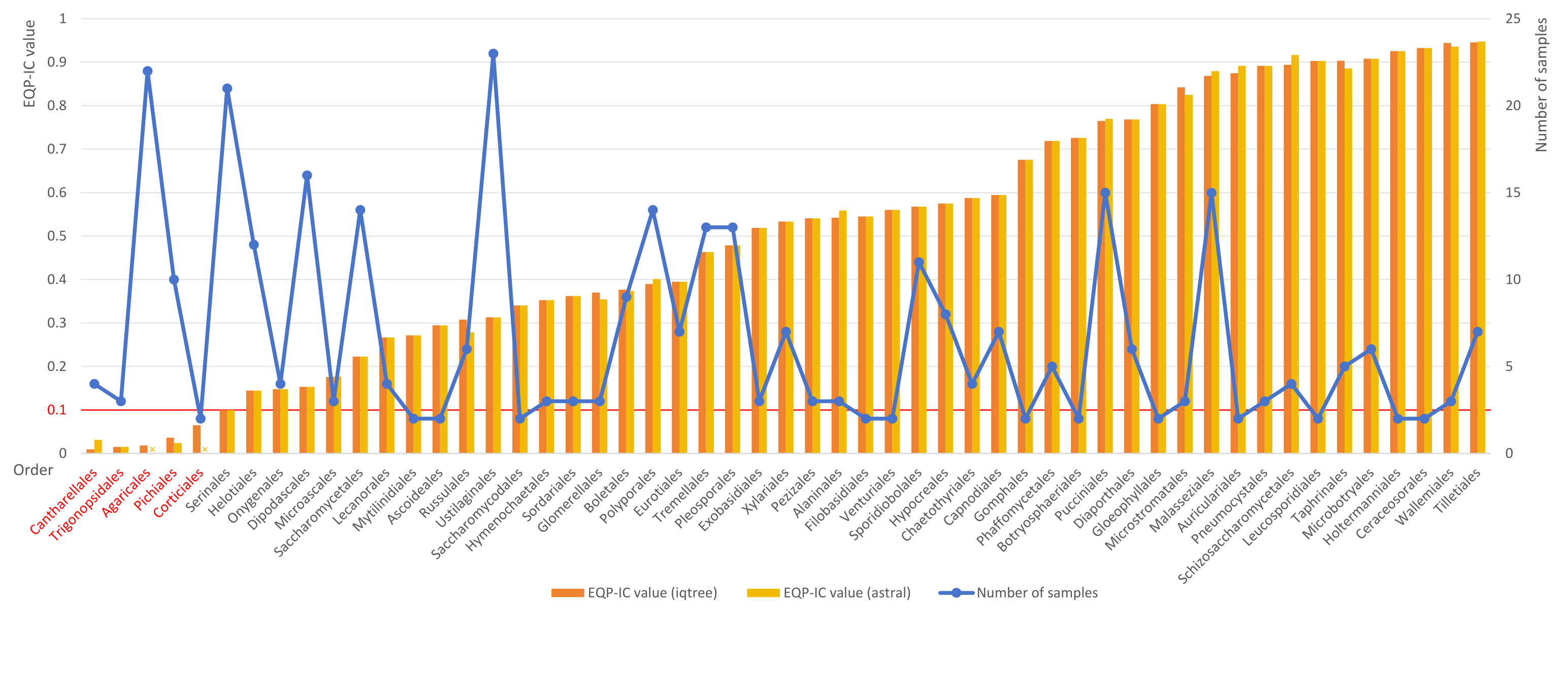 建立自然合理的分类系统是生物系统学的核心目标之一。在现代真菌系统学研究中,构建分类系统主要遵循或依据三个原则指标:单系性、形态特征和分化时间。海量基因组数据的积累,为解析真菌“生命之树”提供了全新视角,真菌系统发育和分类也发生了根本性转变。但新的挑战随之而来:在基于不同基因组数据集或分析方法构建的系统发育树间,有时会出现高支持率但互相冲突的拓扑结构,也即系统发育树中高支持率的“支系(clades)”未必就是单系性的。真菌系统学研究中经常使用的上述三个指标难以有效应对这一挑战。 针对该问题,中国科学院昆明植物研究所杨祝良研究团队在开展真菌界双核亚界基因组数据分析的基础上,提出“扩展的四分法内部节点确定性(the extended quadripartition internode certainty,EQP-IC)值”作为建立真菌目级、亚目级和科级分类阶元的指标。EQP-IC值是评估基因树与物种树间拓扑结构冲突程度的指标,该值越高表明系统发育冲突程度越低,拓扑结构越稳定,对应支系与自然分类群的关联性也越强。该研究基于真菌界已发表的540个物种的基因组数据,利用290个基因序列,构建基因树和物种树,使用QuartetScores软件计算EQP-IC值,对子囊菌门(Ascomycota)和担子菌门(Basidiomycota)下的94个目进行了统计分析。结果显示,除仅含1个样品的41个目外,余下的53个目中的48个目的EQP-IC ≥ 0.1(图1中横坐标标记为黑色字体的各目);而EQP-IC值低于0.1的5个目,其本身的范围界定存在问题(图1中横坐标标记为红色字体的各目)。据此,该研究建议在使用基因组数据进行高等级分类阶元界定时,在遵循单系性原则的基础上,使用EQP-IC值大于0.1作为判定标准。
