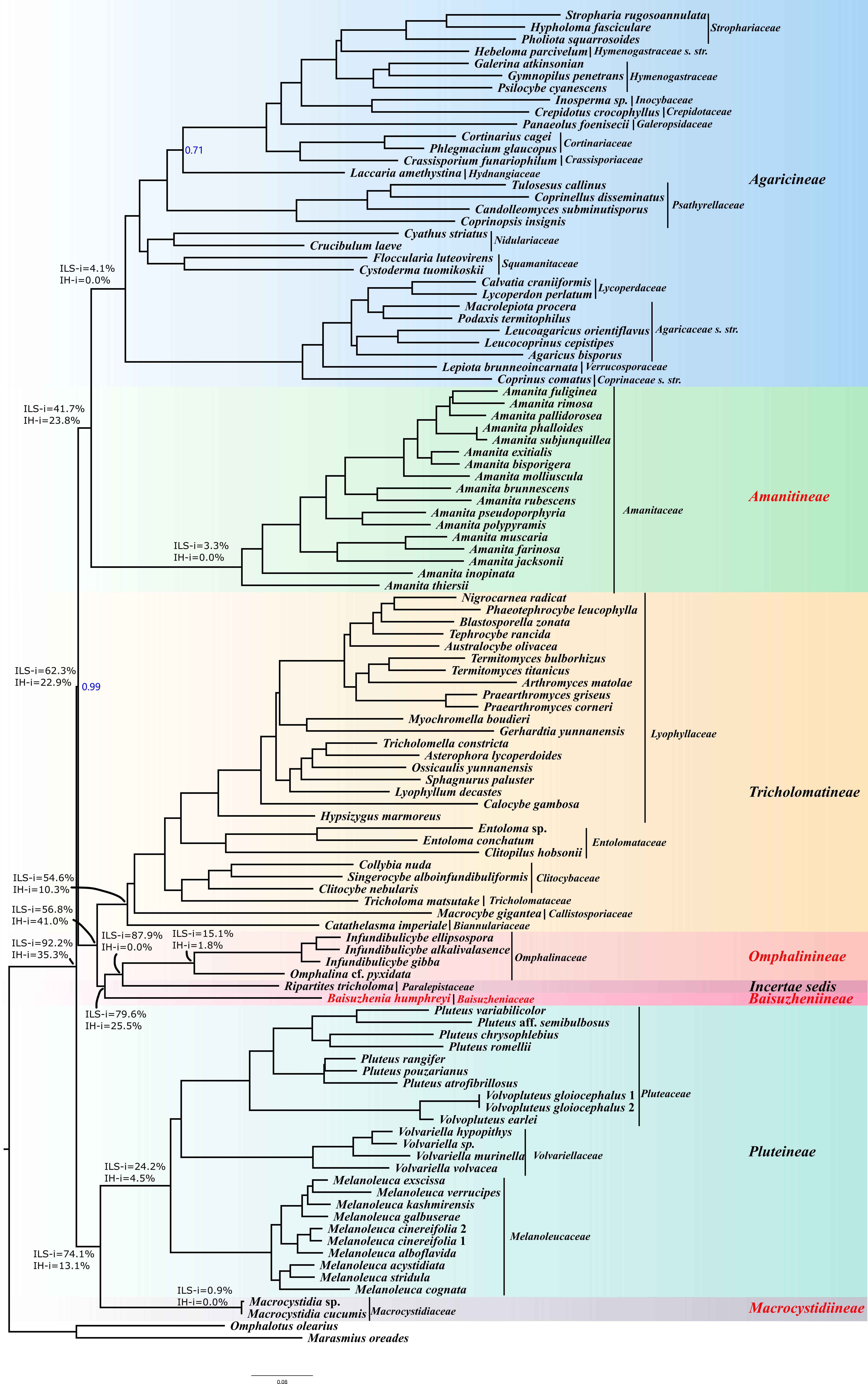图1 子囊菌门和担子菌门下各目的EQP-IC值统计图。左边纵坐标为EQP-IC值,右边纵坐标为样品数目,横坐标为目拉丁名。 条形图为各目的EQP-IC值,折线图展示各目囊括的样品数。 在此基础上,研究人员以蘑菇目Agaricales中系统发育冲突较为显著的蘑菇亚目Agaricineae-光柄菇亚目Pluteineae-口蘑亚目Tricholomatineae(简称“APT”)为研究对象,囊括了142个基因组(其中自测64个)数据,深度解析了其系统发育关系。Phytop分析表明APT各亚目内存在广泛且强烈的不完全谱系分选和渐渗/杂交信号,其下各支系间的关系可能呈网状进化模式,二歧分支的系统发育树难以反映其真实的演化历史。整合系统发育分析结果、EQP-IC值和形态学特征,该研究在原有ATP三亚目的基础上,新增了3个新亚目:鹅膏亚目Amanitineae、大囊伞亚目Macrocystidiineae和亚脐菇亚目Omphalinineae。此外,研究发现过去隶属于拟韧革菌目Stereopsidales的物种绒盖拟韧革菌Stereopsis humphreyi与APT亲缘关系较近,形成一个独立的支系,该研究为其建立了新亚目素贞菌亚目Baisuzheniineae、新科素贞菌科Baisuzheniaceae、新属素贞菌属Baisuzhenia和新组合素贞菌Baishuzhenia humphreyi。