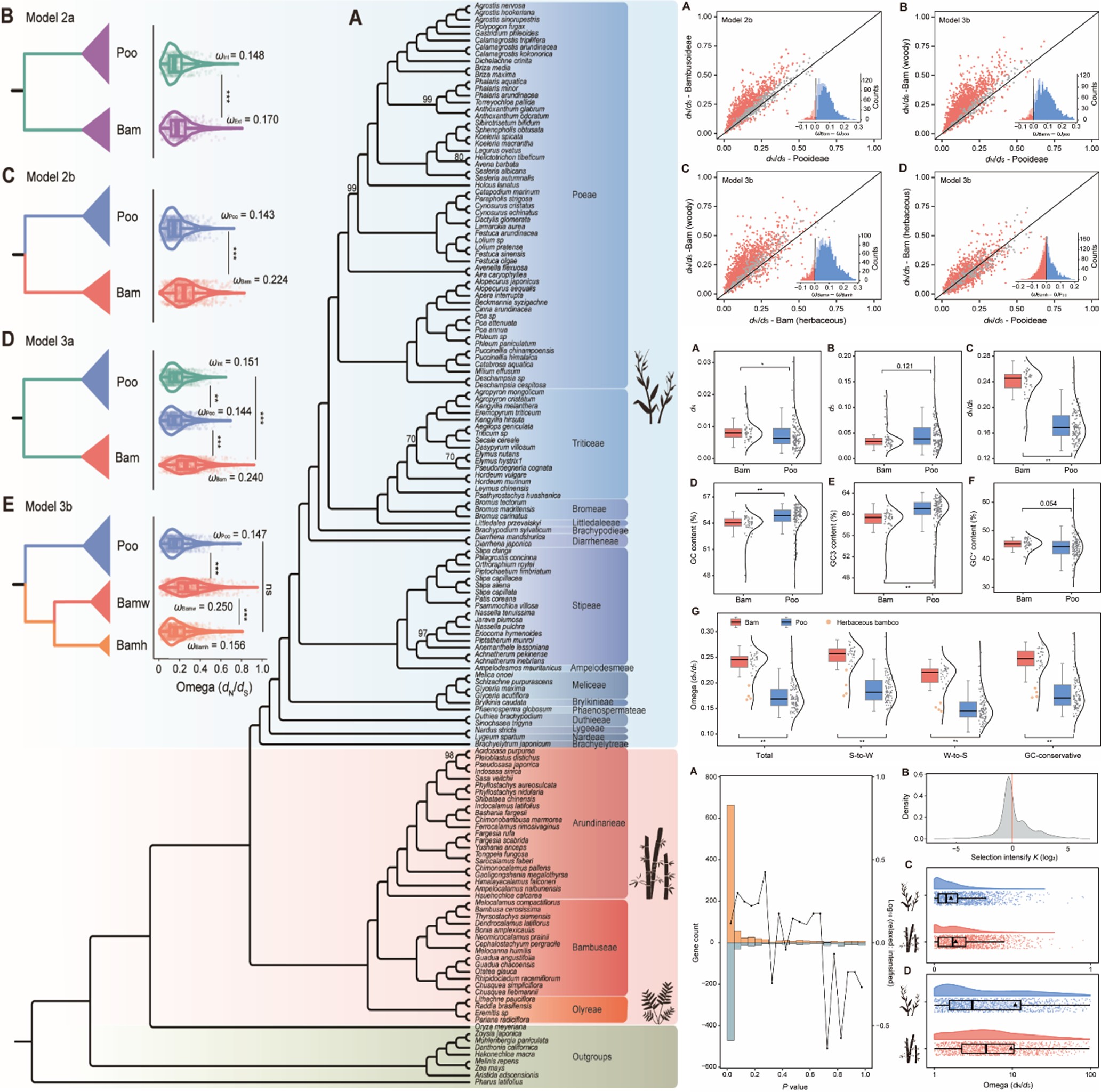 研究发现,木本竹类的蛋白分子进化速率(dN/dS)显著高于有性繁殖的草本竹类和早熟禾,这主要归因于其经历了更为宽松的纯化选择(Relaxed purifying selection)。相比之下,虽然非选择性机制如gBGC在两个亚科中均表现为轻微降低dN/dS的趋势,但其影响程度相近,难以解释所观察到的系统性差异(图1)。研究进一步构建多种回归模型分析发现,繁殖方式相较于其他生活史指标(开花周期,株高等)和有效群体大小代理指标(分布点数量,分布面积等),更能有效解释该类群间的分子进化速率的系统性差异(图2)。