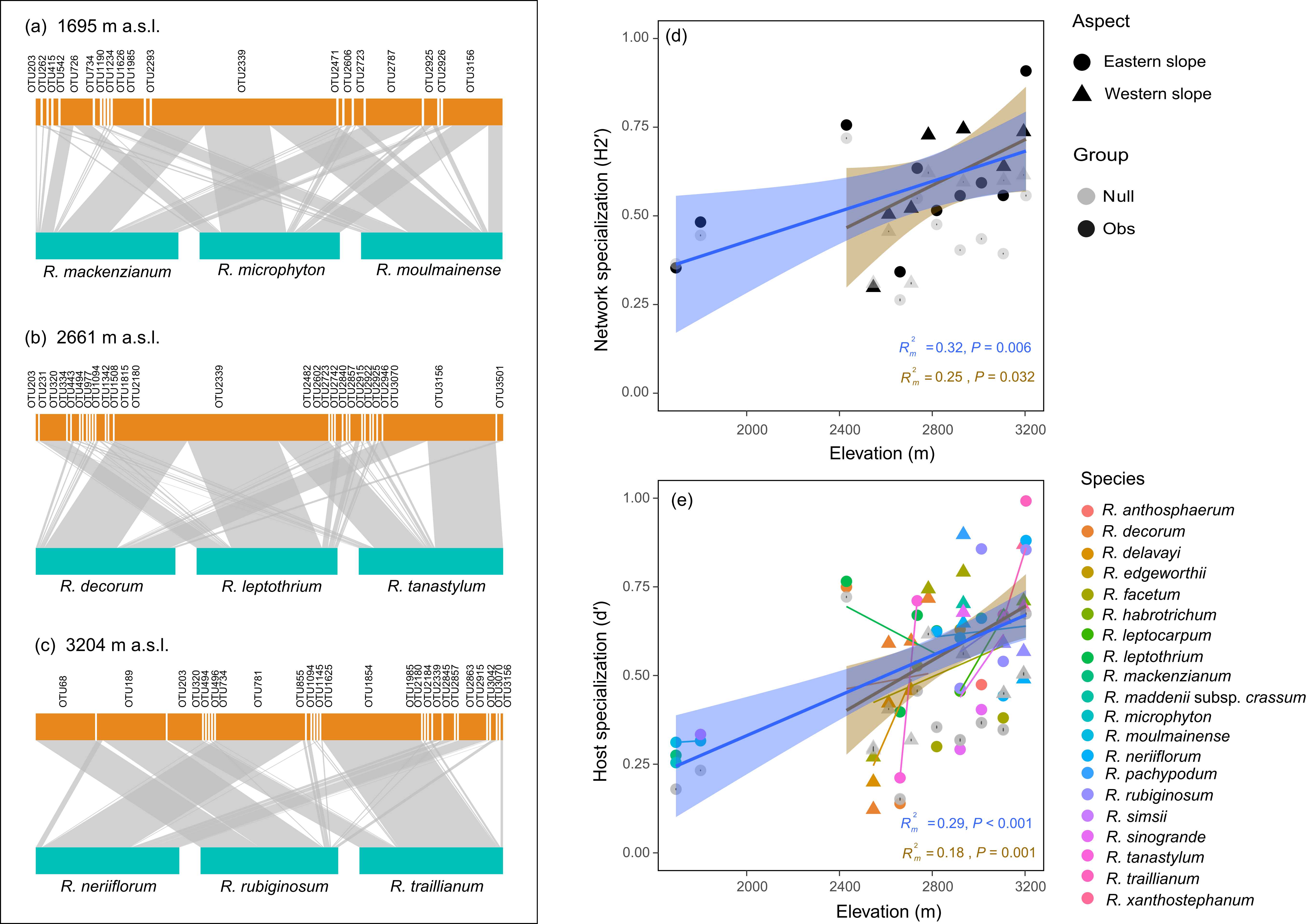 图3 沿海拔梯度的杜鹃花属植物–杜鹃花类菌根真菌互作网络 (a–c),以及网络特化程度 (d) 与寄主特化程度 (e) 的变化 |