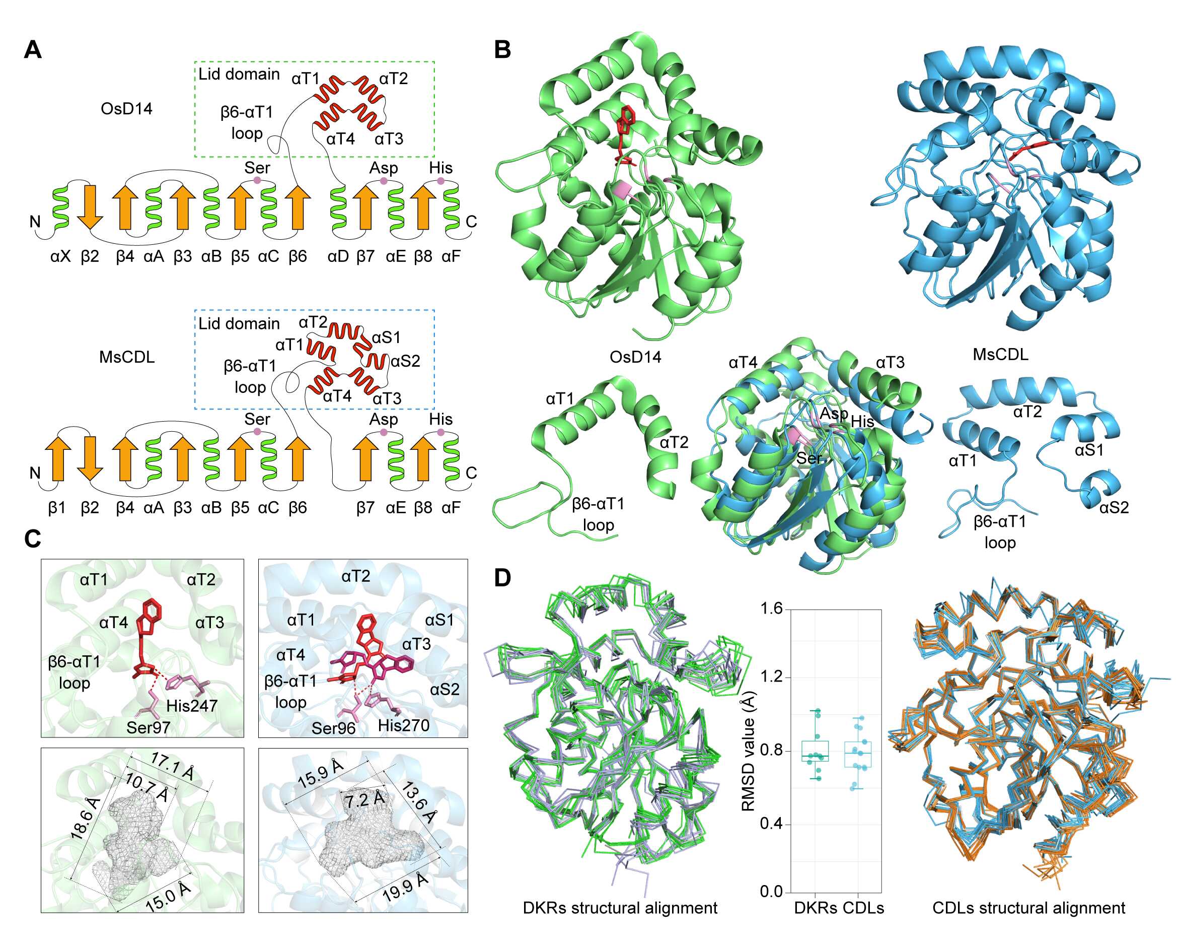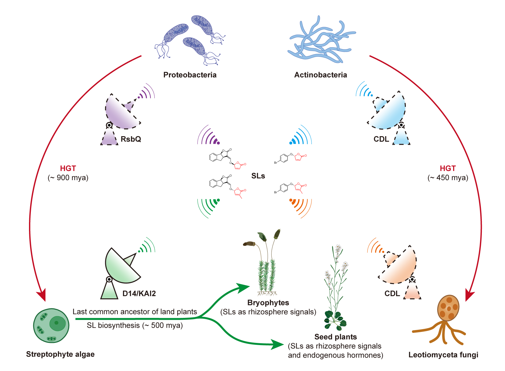 独脚金内酯(Strigolactones,SLs)是一类由类胡萝卜素衍生而来的丁烯酸内酯化合物。作为重要的植物内源激素,独脚金内酯在植物生长发育的多个方面(如分枝、根系形态等)发挥调控作用。越来越多的研究表明,独脚金内酯还能作为根际信号被某些真菌和细菌所感知,进而调控它们与植物的互作。这些发现引出了有趣的科学问题:独脚金内酯如何被不同生物类群所感知、转导和代谢?在植物、真菌和细菌中,相关分子机制是否存在进化上的关联? 在植物中,独脚金内酯受体是由D14/KAI2基因编码的α/β水解酶,该水解酶具有感知和水解独脚金内酯的双重功能。先前研究表明,植物的D14/KAI2是通过水平基因转移(Horizontal gene transfer,HGT)起源于变形菌门细菌的RsbQ基因,形成横跨植物与细菌的D14/KAI2/RsbQ(DKR)家族。RsbQ基因的获取不仅是植物建立独脚金内酯信号系统的关键一步,也代表了植物适应陆地环境的重要创新事件。近期,在植物致病真菌Cryphonectria parasitica中鉴定到的另一种α/β水解酶CpD14,也被证明具有独脚金内酯结合与水解活性,并且能够介导该真菌对独脚金内酯的响应。这表明CpD14 在真菌中是独脚金内酯信号系统的关键组分,也是潜在的独脚金内酯受体。 为了全面评估CpD14同源序列的分布,研究人员在多个生物基因组数据库中进行了广泛的搜索比对。结果发现,具有显著相似性的CpD14同源序列集中分布在锤舌菌类真菌和放线菌门细菌当中,形成了跨越真菌与细菌的CpD14-like(CDL)家族(图1)。进一步的分析表明,CDL最可能起源于细菌,在约4.5亿年前通过一次水平基因转移事件,从放线菌处转移到锤舌菌类真菌共同祖先当中。有趣的是,CDL基因多被与陆生植物相关的病原真菌、内生真菌或腐生真菌所保留,而在地衣化真菌类群中普遍丢失。最近的研究表明,独脚金内酯的生物合成途径约在5亿年前从陆生植物当中演化出来,且独脚金内酯最初可能是作为植物与真菌的根际共生信号,而非内源激素发挥作用。鉴于真菌中CDL的水平获取时间紧随其后,若CDL最初被锤舌菌类真菌用于识别和响应植物的独脚金内酯信号,则其在特定真菌类群中的选择性保留模式可以得到合理解释。 通过X射线晶体衍射技术,研究人员解析了一个具有高分辨率的CDL代表性蛋白结构,该蛋白来自放线菌Microlunatus sagamiharensis,被命名为MsCDL(图2)。进一步分析表明,CDL与DKR蛋白共享保守的核心“α/β折叠”结构以及催化三联体的空间位置。但不同于DKR,CDL的盖子结构包含两条额外的短α螺旋(αS1-αS2),且其αT1-αT2螺旋旋转约90度形成三角形的盖子上部。尽管盖子结构不同,CDL的配体结合口袋与DKR类似。分子对接模拟显示,典型的独脚金内酯分子能穿过CDL的盖子结构并结合在其口袋内。这些结果表明,CDL与DKR是两种不同结构类型,但分子功能趋同的α/β水解酶。 通过生物化学实验,研究人员探讨了独脚金内酯结合与水解活性在CDL与DKR蛋白中如何演化。实验结果表明,变形菌RsbQ和放线菌CDL蛋白对不同类型的独脚金内酯表现出不同程度的亲和力、水解活性和构象变化,说明细菌α/β水解酶已经具备结合和水解独脚金内酯的功能活性,代表了一种进化上的预适应(pre-adaptation)。植物D14/KAI2和真菌CDL蛋白在继承这些功能活性的同时,通过与独脚金内酯的互作,逐渐演化出更适合其生物学功能的配体选择性特征。 基于现有的认知,研究人员提出一个独脚金内酯信号系统在不同生物类群中的演化路径模型(图3):在植物产生独脚金内酯之前,细菌已演化出多种α/β水解酶(如RsbQ和CDL)用于裂解丁烯酸内酯或相似的酯类。这些α/β水解酶的结构框架决定了其具有独脚金内酯结合与水解活性的潜力。约9亿年前,变形菌RsbQ基因通过水平转移被链型植物的共同祖先所获得,并演化为D14/KAI2以催化类似的酯类裂解反应。在独脚金内酯的生物合成途径于约5亿年前从陆生植物中演化出来后,D14/KAI2作为受体被纳入植物的独脚金内酯信号系统当中。在真菌中,放线菌CDL基因在约4.5亿年前通过独立的水平转移事件被锤舌菌类真菌的共同祖先所获取。与植物D14/KAI2类似,结构和功能上预适应的RsbQ与CDL蛋白可通过简单的氨基酸替换,在真菌和细菌中演化为特定类型的独脚金内酯受体或响应蛋白。该研究不仅证明功能预适应基因的独立水平转移事件可以引发重大创新性状的趋同演化,还为跨界生物类群中独脚金内酯信号系统的起源与演化提供了新见解。 相关研究成果以Independent horizontal transfer of genes encoding α/β-hydrolases with strigolactone binding and hydrolytic activities from bacteria to fungi and plants为题,近日在线发表于植物学知名期刊Molecular Plant。中国科学院昆明植物研究所王洽副研究员为论文的第一作者,黄锦岭研究员与澳大利亚塔斯马尼亚大学Steven M. Smith教授为论文的通讯作者。昆明植物研究所叶烨工程师、关艳龙副研究员、王双华副研究员、孙航院士,大连民族大学王路路讲师,以及中国药科大学汪哲教授参与了此项研究工作。研究得到国家自然科学基金、中国科学院青年创新促进会、云南省“兴滇英才支持计划”、云南省基础研究计划、国家重点研发计划、青藏高原二次科考,以及澳大利亚研究理事会卓越中心等基金项目的支持。