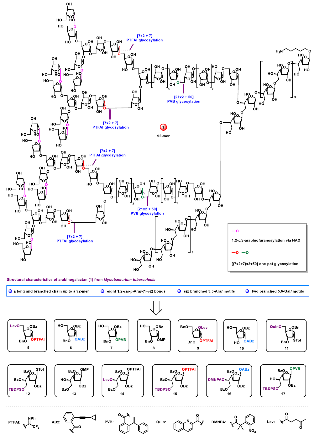 结核病是由结核分枝杆菌感染引起的一个古老而迄今依然威胁人类健康的重要疾病和重大公共卫生问题。根据世界卫生组织报告,仅2019年,全球结核病死亡人数超过100万,新发结核病例约1000万。此外,出现耐药结核病、广泛耐药结核病和人类免疫缺陷病毒共感染进一步恶化了结核病的治疗。现在,结核病的治疗往往是一个周期长且费用昂贵的过程。目前,预防结核病的疫苗只有一种,即卡介苗。然而,卡介苗只对儿童有良好的预防效果,对成年人的有效率在0%到80%之间波动变化。因此,开发新的、有效的药物和疫苗来治疗和预防结核病仍然迫切和重要。 结核分枝杆菌表面覆盖着一层厚厚的蜡状细胞壁,从而对化学治疗药物的进入形成了一个巨大的和复杂的屏障。抑制细胞壁的生物合成是目前一些成功的一线药物的主要作用机制。阿拉伯半乳聚糖(AG)是结核分枝杆菌细胞壁的主要成分之一,是研发治疗结核病的药物、疫苗和诊断方法的重要分子。最近,中国科学院昆明植物研究所植物化学与天然药物全国重点实验室肖国志专题组通过基于糖基邻(1-苯基乙烯基)苯甲酸酯(PVB)的正交一锅糖苷化反应策略(Acc. Chem. Res. 2025, 58, 2350),模块化高效合成结核分枝杆菌阿拉伯半乳聚糖92糖1(图1)。同时,子结构多糖序列14糖2,30糖3和50糖4也被合成用于构效关系研究。使用分子动力学模拟和核磁共振光谱进行构象分析,以及在人体细胞模型中对阿拉伯半乳聚糖1–4的免疫学研究表明,表面暴露的30糖3仅引发适度的 NF-κB 激活,同时保持细胞活力。 该研究成果以Chemical Synthesis of Arabinogalactans from the Mycobacterium tuberculosis Cell Wall up to the 92-mer and Structure–Conformation–Activity Relationship Studies为题发表在《德国应用化学》(Angew. Chem. Int. Ed. 2025, e202515896)。该工作的第一作者为马雨欣博士生,共同第一作者为Ferran Nieto-Fabregat博士和范韩缨子硕士。该研究成果得到了国家自然科学基金优秀青年基金项目等的大力资助。