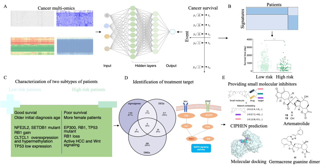 肝细胞癌是常见恶性肿瘤,目前药物尚无法满足临床需求,仍需寻找新的治疗靶点及先导分子。中国科学院昆明植物研究所植物化学与天然药物全国重点实验室陈纪军研究团队近年来致力于蒿属植物中抗肝癌活性倍半萜二聚体的发现、合成与结构优化、作用机制与靶标及创新药物研究。团队前期从蒿属植物中发现系列具有显著抗肝癌活性的倍半萜二聚体—活性显著强于相应单体。基于仿生的Diels-Alder反应,构建了倍半萜二聚体的合成方法。 基于深度学习的多模态模型能够高效挖掘肿瘤多组学数据揭示新的治疗靶点。团队提出DLCP模型,通过对肿瘤多组学数据与患者生存信息的高效整合,实现了对肝细胞癌患者的分子分型、预后生物标志物识别并推荐了潜在的抗肝癌优势分子。DLCP实现了肝癌高、低危患者的分子分型,筛选到预后生物标志物Rac 家族成员RAC1。通过分子对接、动力学模拟及课题组前期开发的基于深度学习的化合物靶点预测模型CIPHEN,DLCP模型成功筛选到倍半萜二聚体衍生物KGA-1083b。实验表明KGA-1083b对三株肝癌细胞(SK-Hep-1,HepG2,Huh7)均显示出显著抑制活性,IC50均低于10 μM, SPR 实验获得KD 值17.3 μM,CETSA实验表明 KGA-1083b 可以使得RAC1 的热稳定性增加。综上, DLCP 为将深度学习应用于癌症预后分析方面提供了一个成功的范例,它通过整合多样化的多组学数据和临床表型揭示了肝细胞癌发展的分子机制,加速了候选药物分子的发现。