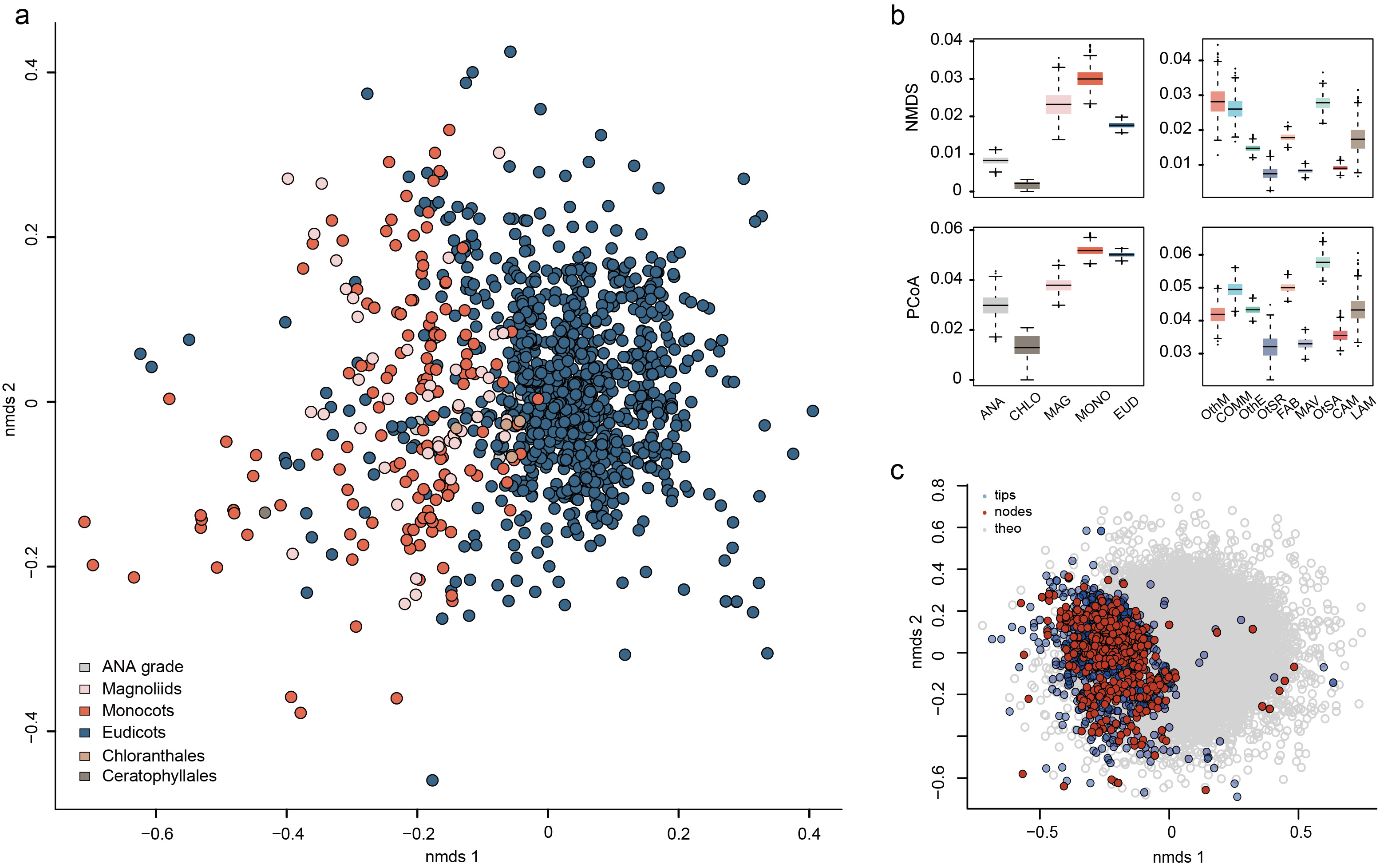 图3 随时间变化的被子植物花粉形态多样性(disparity through time, DTT):a) 基于nmds排序;b) 基于被子植物冠群不同起源时间假说;c) 基于100次随机子采样(n=1000) 该研究成果以Pulsed evolution shaped extant angiosperm pollen disparity为题,在线发表于Nature Communications上。中国科学院昆明植物研究所骆洋博士为论文第一作者,王红研究员和李德铢教授为共同通讯作者。参与研究的还有昆明植物所李洪涛研究员、陆露博士(现昆明医科大学教授)、张明英博士(现陕西中医药大学副教授)、俞英博士(现黄山学院副教授)、蒋伟博士(现云南省农业科学院副研究员)、陶至彬博士(现武汉植物园副研究员)、何华杰工程师、杨丽娥博士(现云南省农业科学院助理研究员)、张莹钧硕士(现湖南农业大学教师),以及合作单位英国爱丁堡皇家植物园Stephen Blackmore教授、Alexandra H. Davey博士,美国莫瑟尔大学Kevin S. Burgess教授和德国明斯特大学Phillip E. Jardine博士。该研究得到了国家自然科学基金委重大国际合作项目(31320103919)、中国科学院战略性先导专项(XDB31000000)、云南省“兴滇英才支持计划”青年人才项目(XDYC-QNRC-2023-0553)和国家自然科学基金青年项目(31700181)等项目的资助。 |