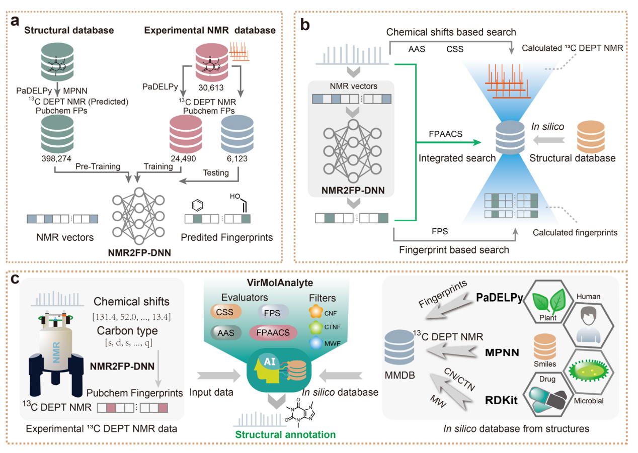 天然产物是来源于微生物、植物和动物的一类结构高度多样的化学物质,在新药发现、化学生态和代谢组学等领域研究中占据重要地位。尽管实验室自动化以及分离鉴定技术的快速发展显著提升了天然产物的发现效率,但其结构解析仍然高度依赖人工经验和多维谱学验证,过程复杂、周期漫长,已逐渐成为制约天然产物研究与应用开发的关键瓶颈。 中国科学院昆明植物研究所植物化学与天然药物全国重点是实验室邱明华研究团队近年来持续聚焦于基于深度学习方法的天然产物结构与活性研究。在前期工作中,团队系统梳理并深入讨论了机器学习辅助光谱解析在天然产物研究中的一系列前沿技术(Natural Product Reports, 2023, 40, 1735-1753),为该领域的进一步发展奠定了有价值的理论框架和方法基础。 核磁共振(NMR)是天然产物结构鉴定中最重要的分析工具之一。然而,NMR 谱图的结构注释通常高度依赖成本高昂的实验数据。尽管近年来基于量子化学计算或者人工智能算法生成的虚拟NMR数据在一定程度上扩展了数据库规模,但基于虚拟数据库的结构注释准确率仍然有限。为解决这一问题,研究团队近期提出了一种新的工具 VirMolAnalyte(https://www.virmolanalyte.top/),可在无实验数据依赖下,实现对 ¹³C DEPT NMR 谱图的高质量结构注释。