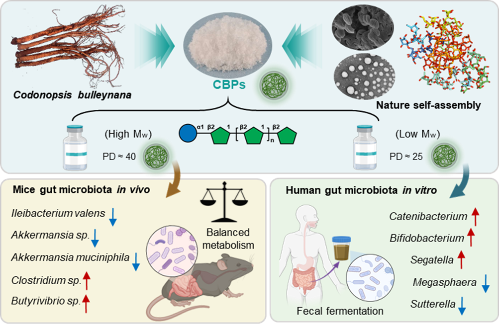图3 臭参多糖的超分子自组装与肠道微生物调节功能研究 该研究不仅阐释了云南特色食药植物臭参发挥肠道健康调节作用的物质基础,也为其在功能性食品等大健康领域的开发应用提供了重要的科学依据。相关研究成果以Physicochemical properties and molecular weight-dependent gut microbiota modulation of inulin-type fructans from Codonopsis bulleynana为题发表在国际权威期刊Carbohydrate Polymers上(Pu et al., Carbohydr. Polym., 2026, 381, 125217)。普德兵助理研究员、硕士生梁涛和李轩为共同第一作者,吴明一研究员为通讯作者。该研究在多糖的结构鉴定和超分子结构表征方面,得到了昆明植物研究所分析测试中心张亮和戴国鑫工程师,以及植物多维成像及多样性分析平台谷志佳工程师和马雨倩助理工程师的大力支持。该研究工作得到了国家重点研发计划、中国科学院B类先导专项、国家自然科学基金、云南省特色植物提取实验室开放课题等项目的共同资助。 |