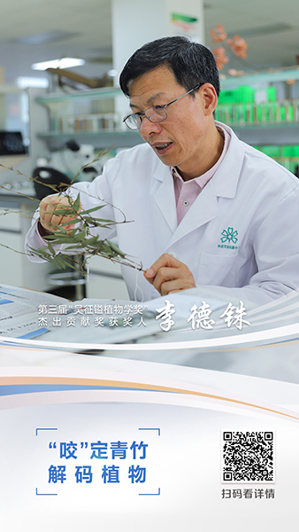 仪式现场 第三届吴征镒植物学奖获奖人简介 杰出贡献奖获得者 李德铢 中国科学院昆明植物研究所研究员、中国西南野生生物种质资源库主任。李德铢研究员长期从事植物分类与系统发育研究,在竹类植物分类、系统发育和演化历史研究方面做出系统性贡献,引领中国植物DNA条形码和新一代植物志研究,解析了被子植物早期演化历史,揭示了东亚植物区系代表类群地理格局成因。他领导建成亚洲最大、国际一流的野生生物种质资源库,建立了集种子、离体材料和DNA库于一体的种质资源保藏体系,实现中国万种野生植物种子的标准化采集和保存。李德铢研究员为我国植物分类学的发展、创新和国际学术地位的提升,以及战略植物种质资源的保护做出了突出贡献。