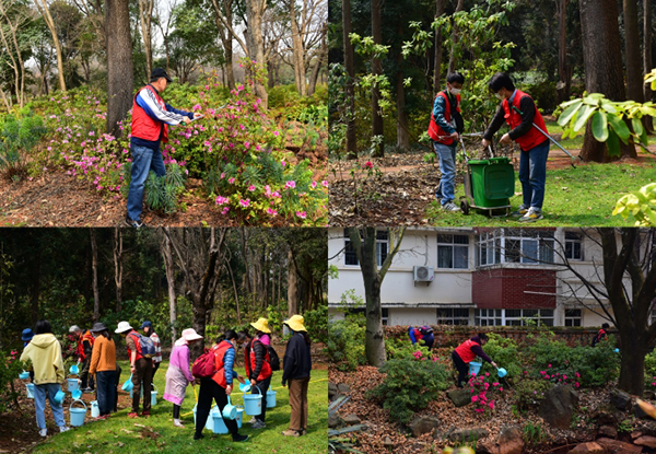 植株修剪 本次集体劳动得到了昆明植物园熊蜂联盟志愿者团队的积极响应。当天一部分志愿者相互配合,在保证安全的情况下,逐片清理高空枯枝与近地面灌丛的枯枝枝叶;支部和志愿者的大部分成员则将水肥精准配比,每人一桶一瓢逐棵浇灌,力求每株杜鹃花都能有效补充微量元素。等到全园浇灌、清理完成,人人均面色红扑,额头泛着晶莹的汗水。