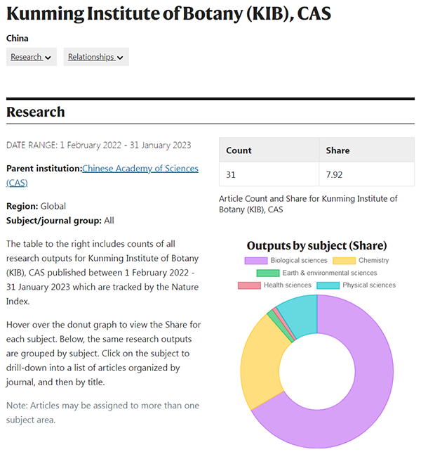 6月15日,2023自然指数最新机构排名榜单 current index/Institution tables发布,此次的自然指数机构排名榜单是基于2022年2月1日至2023年1月31日的统计数据,展示了不同国家和科研机构在自然科学领域高水平科研产出的情况。并且,此次自然指数新增一个研究领域Health sciences。 最新自然指数机构排名榜单中,中国科学院昆明植物研究所(以下称研究所)31篇论文入选,自然指数7.92。研究所入选的论文共涉及生物科学(13篇)、化学(19篇)、地球和环境科学(2篇)、健康科学(2篇)、物理学(1篇)五个研究领域,较去年新增入选健康科学领域。 2022年2月1日至2023年1月31日,研究所入选Nature Index机构排名榜单的论文中,生物科学领域论文主要来自于郝小江、黄胜雄、刘海洋、许建初、杨祝良、朱安丹、刘海洋、颜一军等科研人员的团队。化学领域论文主要来自于郝小江、孙汉董、普诺·白玛丹增、罗晓东、黄胜雄、颜一军、刘海洋、杨玉荣、肖国志、李小年等科研人员的团队。