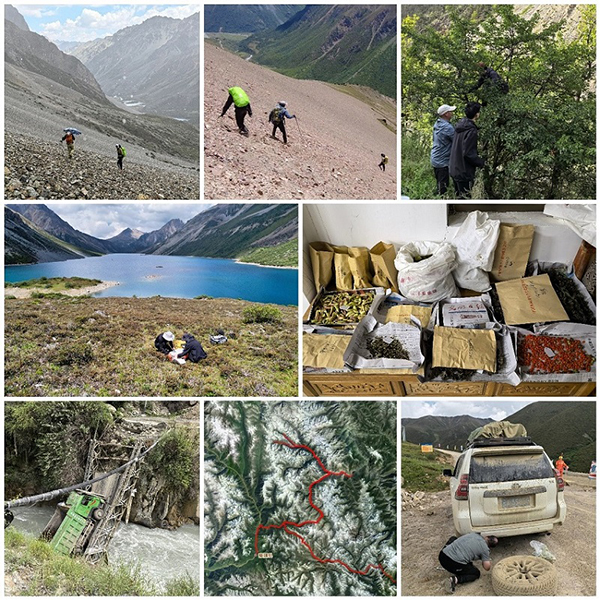 西藏横断山西侧,察隅县、左贡县和八宿县一带,山体呈西北—东南延伸,平均海拔在4000—5000米之间,山间河谷深邃,岭谷高差最大达到2500米,山势险峻,其核心区域人力难以进入,历来植物研究比较薄弱。 8月至9月期间,为加强该区域野生植物种质资源的调查与保存,在国家科技基础资源调查专项“大高黎贡山野生生物种质资源的调查收集与保存”项目(以下简称项目)的支持下,国家重要野生植物种质资源库依托单位中国科学院昆明植物研究所中国西南野生生物种质资源库的采集团队,对察隅县古拉乡及左贡县碧土乡等区域进行野生植物种质资源的调查与采集。 野外科考期间,全体队员从2000米峡谷区徒步深入到5000米高山流石滩的不同植被类型和海拔梯度段,开展调查和采集工作。采集团队克服严重高原反应、气候条件恶劣、断桥断水断电等多重困难,圆满完成既定工作目标。成功采集到包括绵头雪兔子Saussurea laniceps、水母雪兔子Saussurea medusa、桃儿七 Sinopodophyllum hexandrum、光核桃Prunus mira、藏杏Prunus holosericea等重要野生植物种子39份、标本114号331份、分子材料114号216份,拍摄照片2000余张;完成水毛茛Ranunculus bungei、尾叶樱桃Prunus dielsiana、西康金腰Chrysosplenium sikangense、帚状风毛菊Saussurea virgata等重要野生植物的花期踏查和标记工作,为果期种子的采集奠定了基础。通过该项目的实施,将为该区域野生植物种质资源的战略储备、生态安全和可持续发展提供重要的基础信息和实物支撑。 此次科考得到西藏自治区林业和草原局、察隅县林业和草原局、察隅县国家安全委员会、古拉乡公安局和沙堆村村委会的大力支持与帮助。