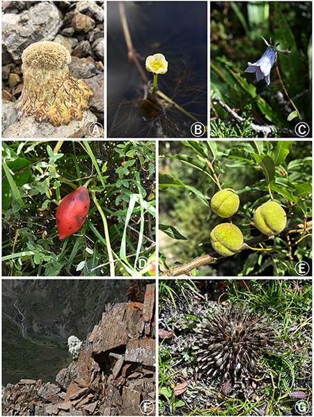 图2 伯舒拉岭部分植物: A.水母雪兔子Saussurea medusa; B.水毛茛Ranunculus bungei; C.脉花党参Codonopsis foetens subsp. nervosa; D.桃儿七 Sinopodophyllum hexandrum; E.光核桃Prunus mira; F.绵头雪兔子Saussurea laniceps; G.皱叶绢毛苣Soroseris hookeriana |