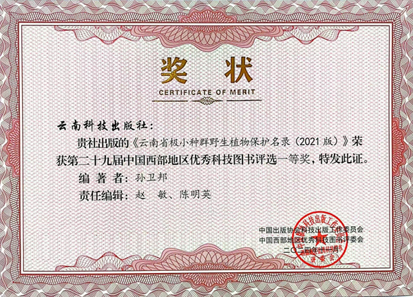 近日,中国科学院院士郝小江作序、中国科学院昆明植物研究所孙卫邦研究员主编、39人参编和68人提供图片的《云南省极小种群野生植物保护名录(2021版)》,荣获第二十九届中国西部地区优秀科技图书评选一等奖。