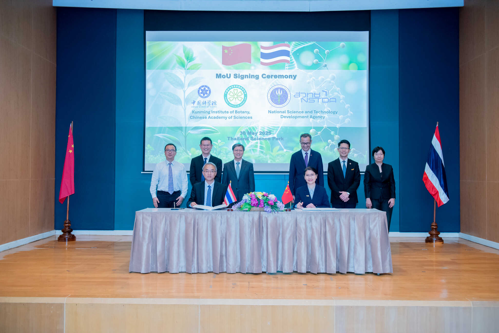 昆明植物所与泰国国家基因工程与生物技术中心签订合作备忘录 文章来源:科技合作处、资源室 | 发布时间:2025-06-03 | 作者:山地未来研究中心,科技合作处 | 浏览次数: | 【打印】 【关闭】 5月30日,在泰国巴吞他尼府的泰国科技园,中国科学院昆明植物研究所与泰国科技发展署(NSTDA)国家基因工程与生物技术中心(BIOTEC)共同举行了合作备忘录(MoU)签署仪式。此次合作标志着双方在种质资源保护、天然产物开发与生物经济等领域的战略合作迈出了坚实的一步。 上午10时,仪式正式开始。BIOTEC执行主任Chaowaree Adthalungrong博士发表欢迎辞。紧接着,昆明植物所所长普诺·白玛丹增发表开幕致辞,并介绍了研究所的基本情况。随后,昆明植物所山地未来研究中心主任许建初分享了构建生物经济产业链的典型案例,中国西南野生生物种质资源库副主任蔡杰介绍了种质资源收集、保藏和创新利用的相关情况。中国驻泰国大使馆科技参赞麻名更也祝贺致辞,表达了对本次合作的美好祝愿。备忘录正式签订前,BIOTEC植物-微生物互作研究团队负责人Nattawut Boonyuen博士还与许建初研究员围绕合作领域共同发表了题为“中泰合作愿景与未来行动计划”的演讲。