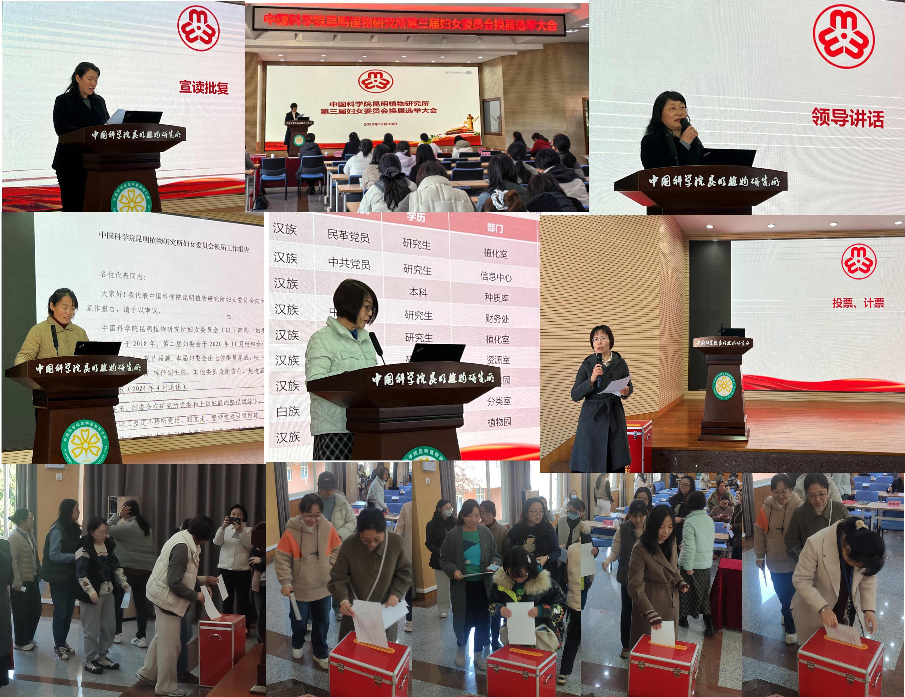12月30日,中国科学院昆明植物研究所第三届妇女委员会换届选举大会胜利召开,大会应到会妇女代表57名,实到会有选举权代表54名。昆明分院妇委会主任赵娜、昆明植物所党委副书记、纪委书记廖雷青出席大会。部分党支部、工会组长代表受邀参会。会议由第二届妇委会委员王蕾主持。 大会在庄严的国歌声中拉开帷幕。与会代表认真听取并审议通过了《中国科学院昆明植物研究所第二届妇女委员会工作报告》。昆明分院赵娜主任宣读《中国科学院昆明分院机关妇女委员会关于中国科学院昆明植物研究所第三届妇女委员会换届选举的批复》。党办主持工作副主任冯石宣读了第三届妇委会委员候选人及《中国科学院昆明植物研究所第三届妇女委员会委员选举办法》,并通过大会审议。大会还审议产生了总监票人、总计票人、监票人和计票人。 根据选举办法,大会采取无记名投票方式,选举产生第三届妇委会委员7名。按姓氏笔画为序,王永翠、杜宁、李培、张馨元、赵逾涵、常玮、谢雪丹7位同志当选第三届妇委会委员。 会上,廖雷青书记向研究所第二届妇委会表示感谢,同时也希望第三届妇委会能够立足岗位多做贡献,以服务全所女职工为出发点开展各项工作,培育先进典型,充分发挥先进性和主动性,引领科技创新,带领广大妇女同志强化攻坚意识,扛起攻坚责任,以巾帼之姿扛起使命担当,为研究所的蓬勃发展、行稳致远注入巾帼力量。会后召开了第三届妇委会第一次会议。