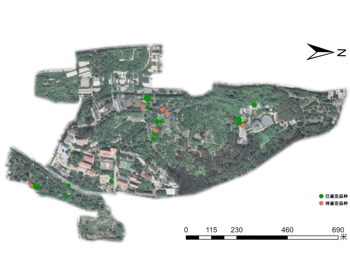 昆明植物园现有48株梅花定植空间分布(制图:朱亚杰)