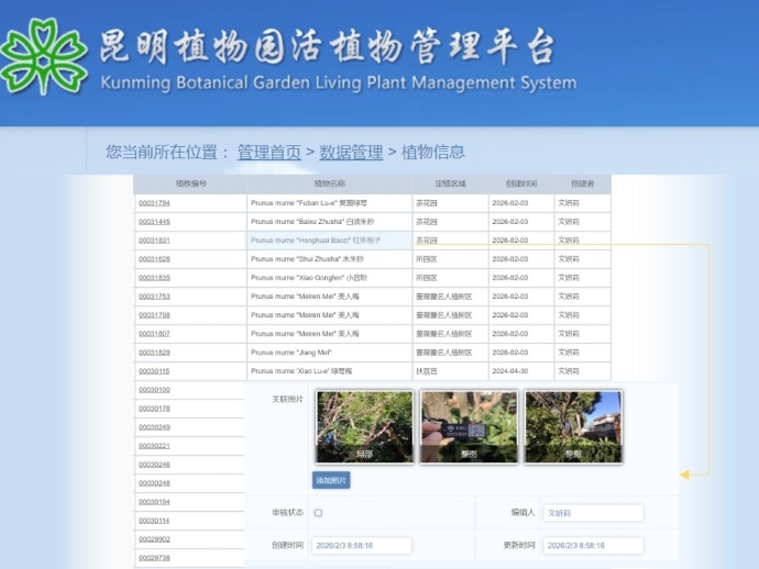 昆明植物园工作人员对PIMS系统梅花品种登录信息更新示例(制图:高富) 据悉,云南是梅的起源地之一,亦是梅的种质资源多样性变异中心。其物种多样性极为丰富,拥有全国最多的古梅资源,现存有世界最古老的元梅。云南的梅花品种有150余个,占全国半数,其中不乏‘台阁绿萼’、‘红怀抱子’等特有品种。昆明植物园在植物资源收集过程中,也开展了梅花原生种及品种的收集保护工作,并在不同专类园区进行栽培和展示,提升了园区的景观效果,增强了对公众的吸引力,实现了植物资源的社会公益性。 |