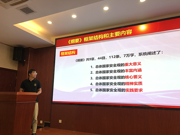 杨扬同志介绍分类室党总支概况 分类室第二党支部书记吴刚同志带领大家学习《总体国家安全观学习纲要》相关内容。《纲要》全面反映了习近平新时代中国特色社会主义思想在国家安全方面的原创性贡献,系统阐释总体国家安全观的基本精神、基本内容、基本方法、基本要求及总体国家安全观的重大意义、丰富内涵、核心要义、精神实质及实践要求。