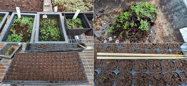 脆弱的杜鹃花幼苗 活动当天参与人员准时抵达扶荔宫保育温室。在大家了解了注意事项并熟悉了工作流程后,分成两个小组,开始了紧张的分苗工作。首先将泥炭土过筛,加入适量水,充分揉拌后,填入16*8的穴盘中。基质准备小组充分发挥了主观能动性,因地制宜、就地取材、克服困难采用了各种创新方式,提高了工作效率。移苗小组本着“每一棵植物都是生命,每一株幼苗就是希望”的原则,许多幼苗的株高不足1cm,同志们呵护着每一株极为脆弱的杜鹃幼苗,用心将一株株纤细、幼小的小苗尽量无损伤地从苗盘中剥离出来,再精细地移植到苗穴盘中。有些同志创造性用筷子代替镊子来操作,更加减少对幼苗的伤害。