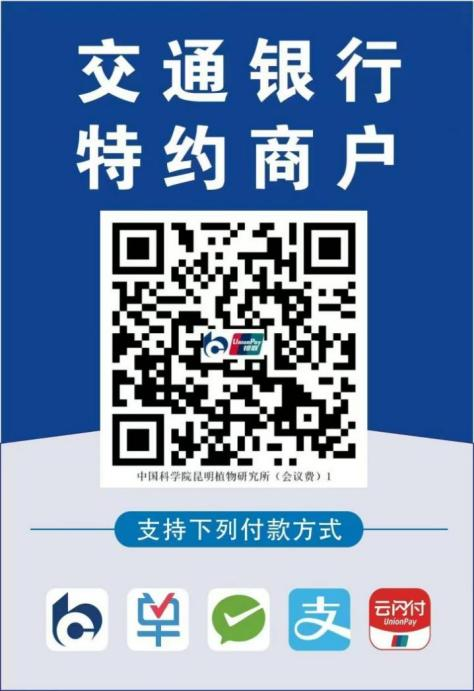 3. 付款方式:支持银行转账支付、扫码支付、现场刷卡或二维码支付,本次会议由会议共同主办方中国科学院昆明植物研究所收取会务费并开具发票。 (1)银行转账支付 开户名:中国科学院昆明植物研究所 开户行:交通银行云南省分行营业部 账号:531 078 157 010 141 100 787 付款时务必备注 “资源化学 2025+姓名+单位”,并将汇款回执发送至会务 组邮箱:jupeng@mail.kib.ac.cn,告知汇款金额、单位与参会人信息。 (2)扫码支付 手机微信/支付宝扫描二维码进入支付页面缴费。扫码支付时请务必在添加付款备注中填写“资源化学 2025+姓名+单位”等信息,并将支付凭证和回执表一起发至组委会邮箱(jupeng@mail.kib.ac.cn)。