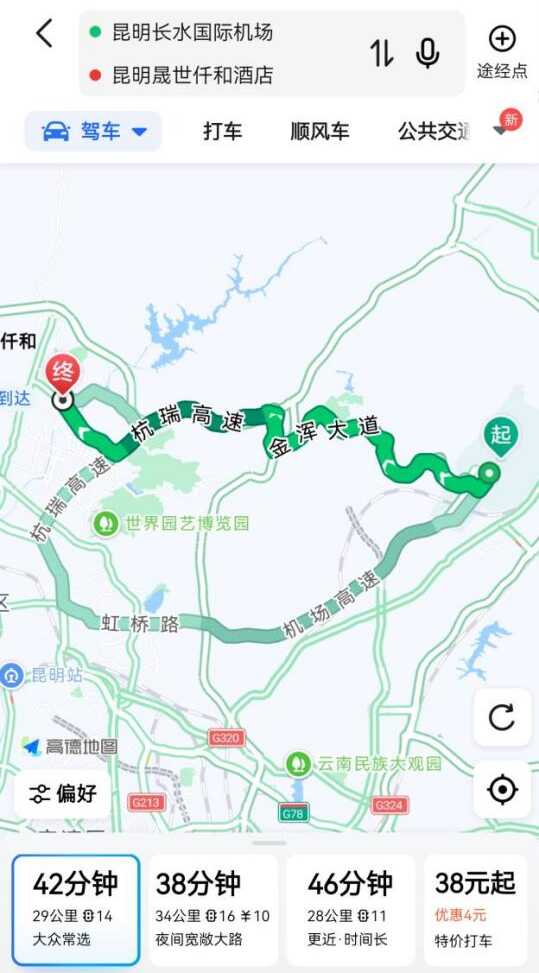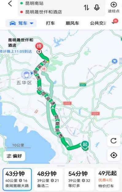 (2)到达昆明火车南站后、可搭乘出租车或网约车到昆明晟世仟和酒店及周边(参考路线见下图、距离约40km、打车费用120元左右)。